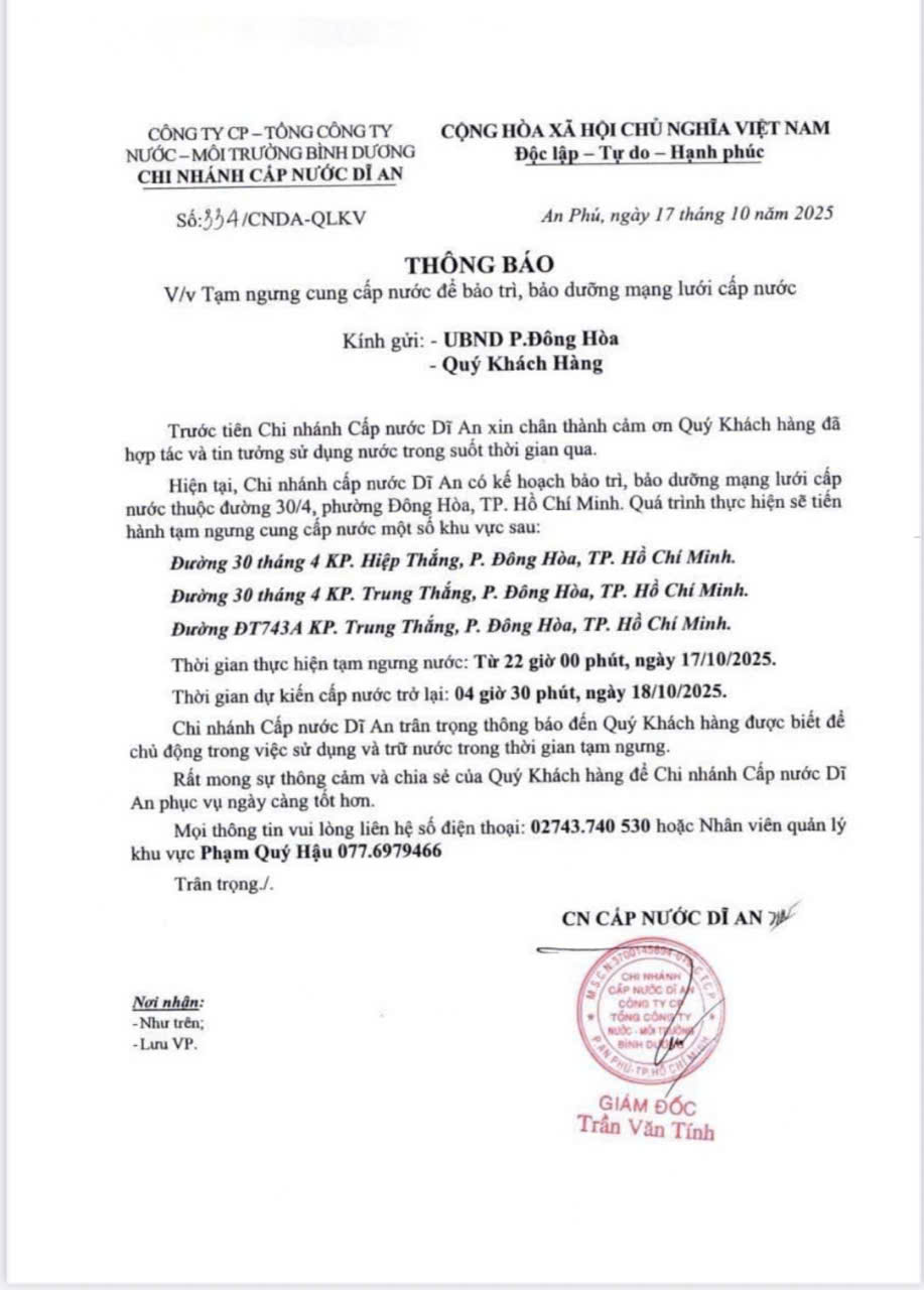 Tạm ngưng cấp nước khu vực Dĩ An: tuyến ống D150 đường Lê Thị Trung, An Phú 13, An Phú 11, An Phú 04, KDC 3/2, KDC Phú Hồng Thịnh 2, lề phải đường Mỹ Phước Tân Vạn (đoạn từ đầu đường Lê Thị Trung đến nhà hàng Hải Nam)