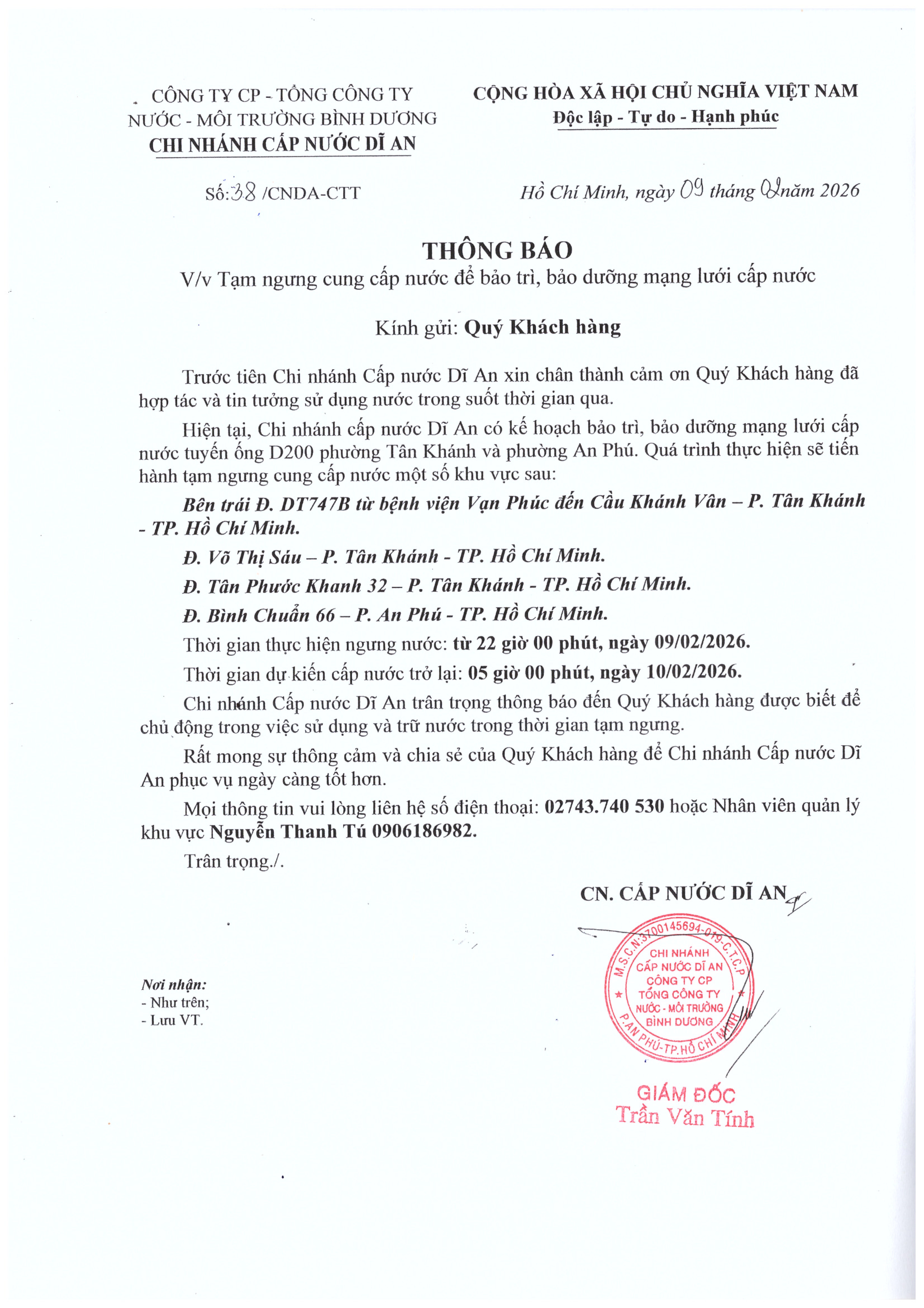 Tạm ngưng cấp nước khu vực Dĩ An: tuyến ống D200 hai bên đường Lý Thường Kiệt (đoạn từ ngã 3 Yazaki đến ngã 4 Đường Mồi), KDC TM Đường Sắt, đường Phan Đăng Lưu, đường Phạm Hữu Lầu, P.Dĩ An, Tp.Hồ Chí Minh