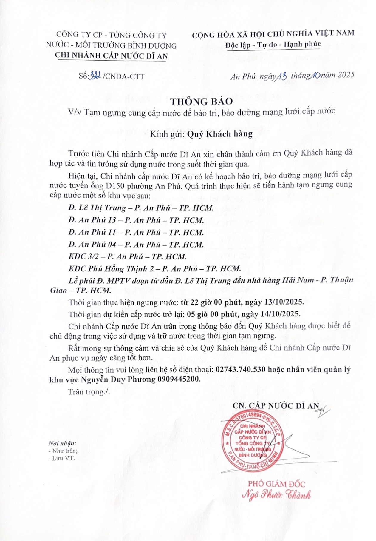 Tạm ngưng cấp nước khu vực Dĩ An: tuyến ống D150 đường Lê Thị Trung, An Phú 13, An Phú 11, An Phú 04, KDC 3/2, KDC Phú Hồng Thịnh 2, lề phải đường Mỹ Phước Tân Vạn (đoạn từ đầu đường Lê Thị Trung đến nhà hàng Hải Nam)