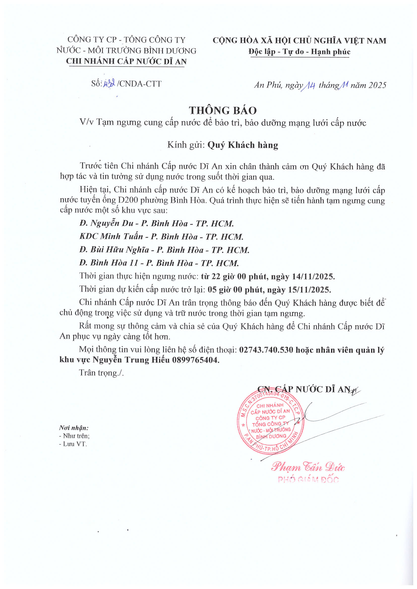 Tạm ngưng cấp nước khu vực Dĩ An: tuyến ống D150 đường Lê Thị Trung, An Phú 13, An Phú 11, An Phú 04, KDC 3/2, KDC Phú Hồng Thịnh 2, lề phải đường Mỹ Phước Tân Vạn (đoạn từ đầu đường Lê Thị Trung đến nhà hàng Hải Nam)