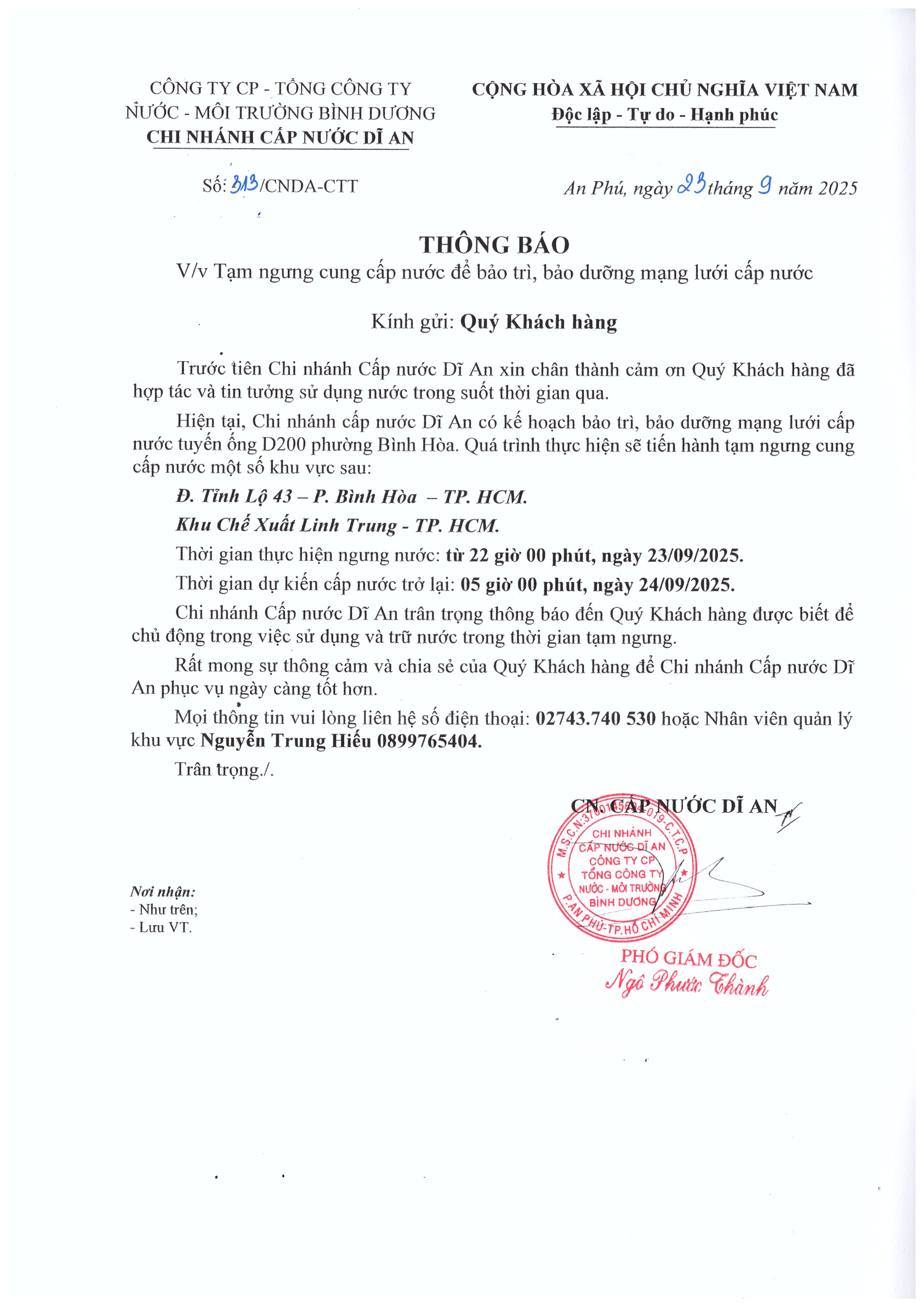 Tạm ngưng cung cấp nước khu vực Dĩ An : Hai bên đường ĐT747A đoạn từ ngã 4 Miễu Ông Cù đến cầu Ông Tiếp - KCN Chí Hùng - Đ.HL401, P. Thái Hòa. Hai bên Đ.ĐT747A đoạn từ ngã 3 Chợ Tân Ba đến trạm thu phí Khánh Bình - Khu TĐC Cảng Thạnh Phước, P. Thạnh Phước