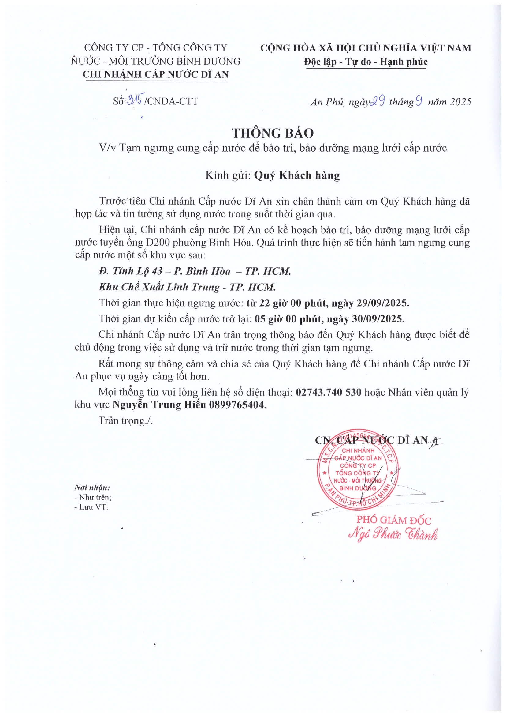 Tạm ngưng cung cấp nước khu vực Dĩ An : KP Bình Đường 2,3 - P. An Bình - TP. Dĩ An -Tỉnh BD. KP 4,5 P. Bình Chiểu, TP. Thủ Đức