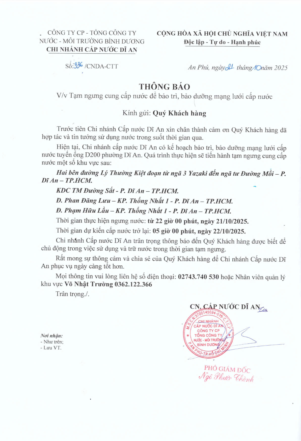 Tạm ngưng cấp nước khu vực Dĩ An: tuyến ống D150 đường Lê Thị Trung, An Phú 13, An Phú 11, An Phú 04, KDC 3/2, KDC Phú Hồng Thịnh 2, lề phải đường Mỹ Phước Tân Vạn (đoạn từ đầu đường Lê Thị Trung đến nhà hàng Hải Nam)