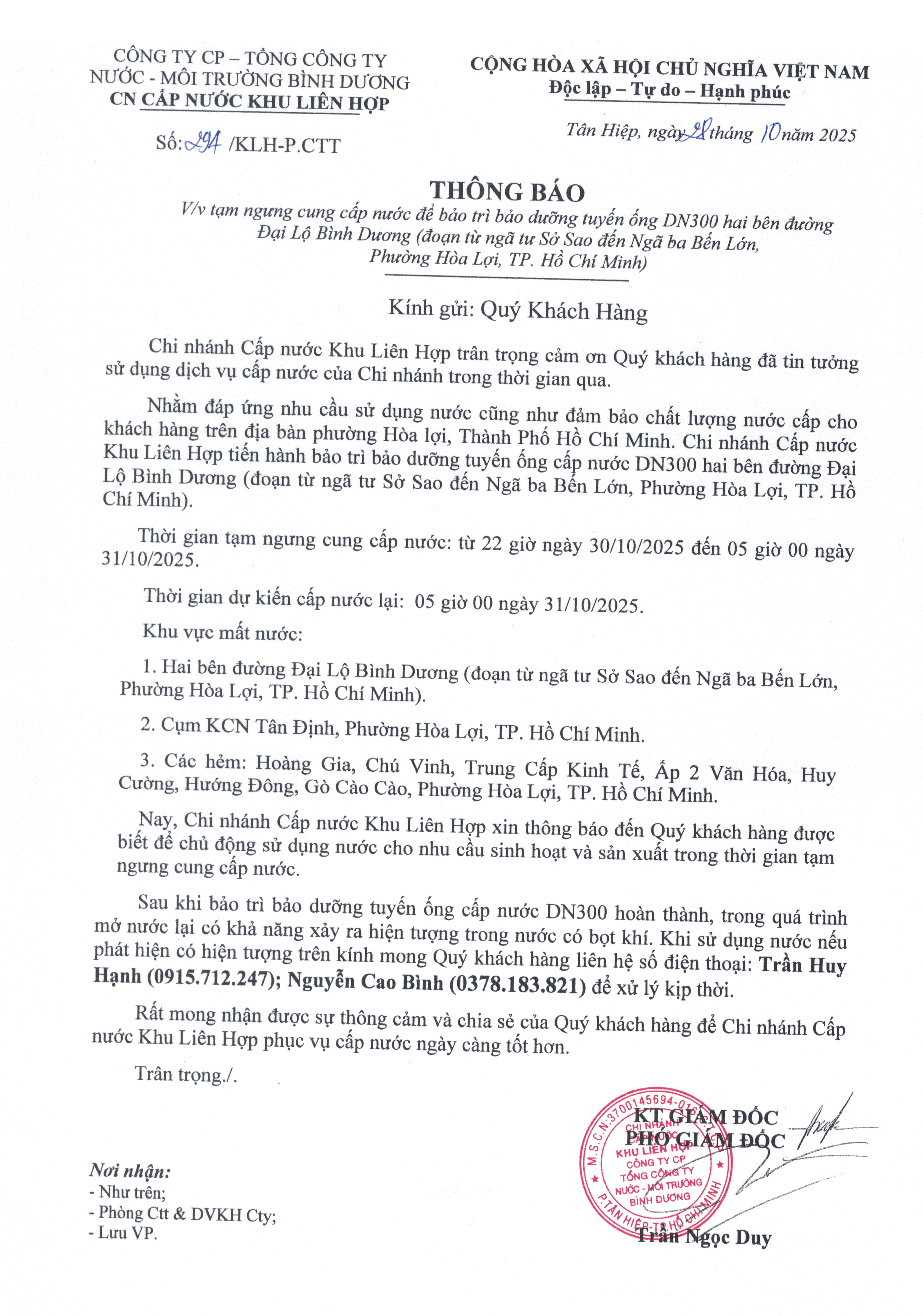 Tạm ngưng cấp nước khu vực Khu Liên Hợp: tuyến ống cấp nước DN300 hai bên đường Đại Lộ Bình Dương (đoạn từ ngã tư Sở Sao đến ngã ba Bến Lớn), P.Hòa Lợi, Tp.Hồ Chí Minh