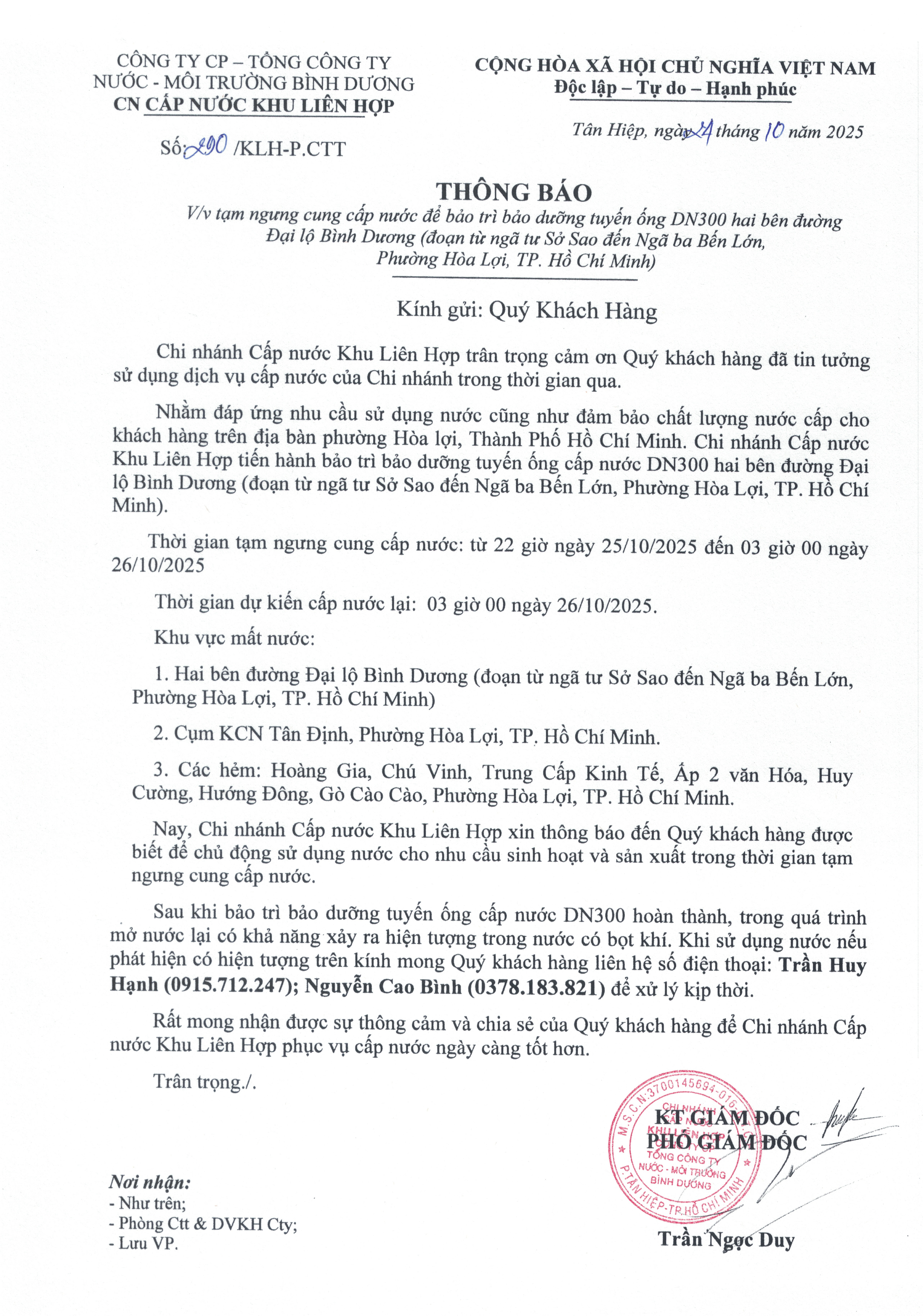 Tạm ngưng cấp nước khu vực Khu Liên Hợp: tuyến ống D150 bên trái đường Đại lộ Bình Dương (đoạn từ ngã ba Bến Lớn đến KTĐC Thịnh Gia), Kp.3, P.Hòa Lợi