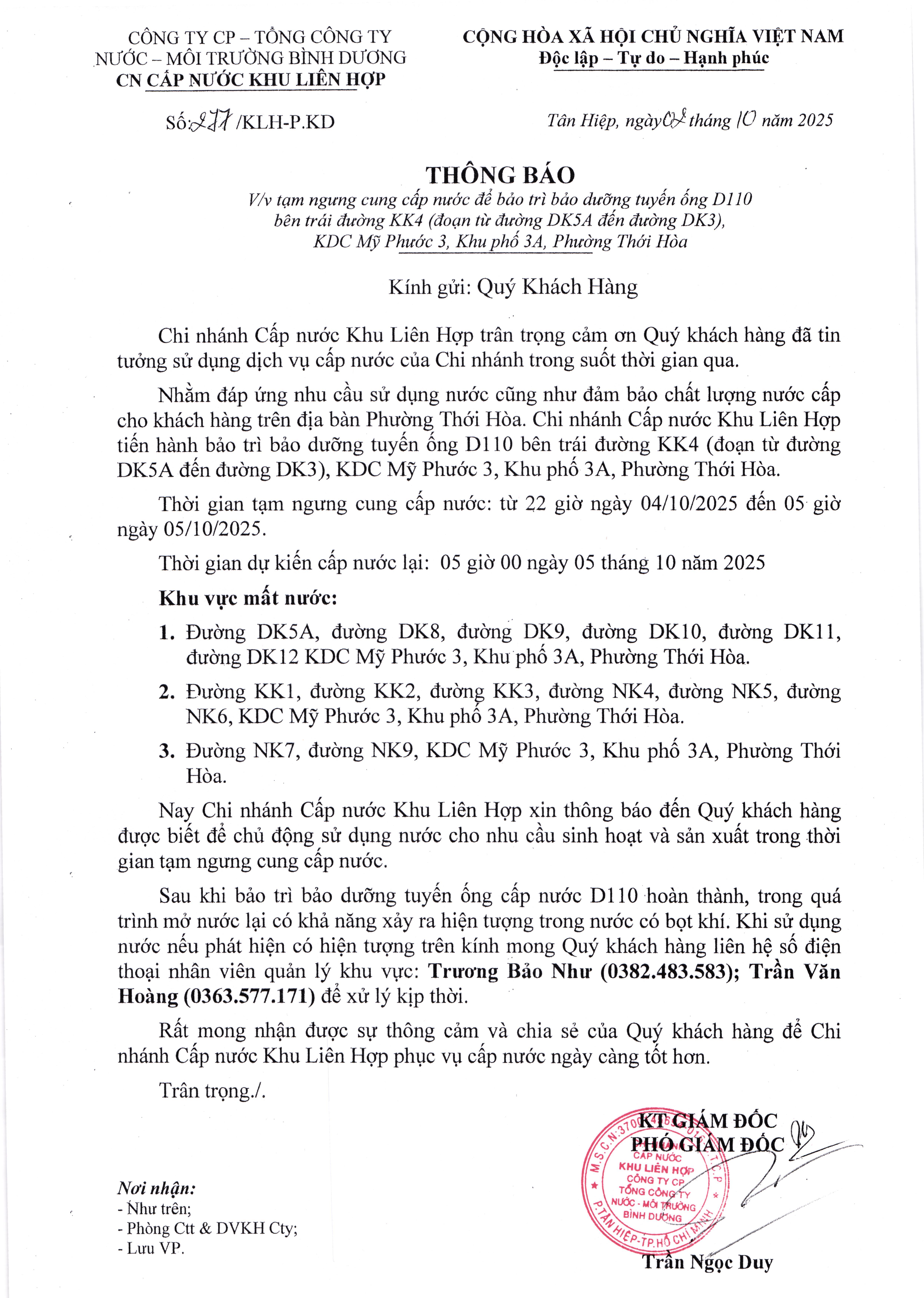Tạm ngưng cung cấp nước khu vực KLH : Đường Đại lộ Bình Dương ( đoạn từ ngã tư ĐLBD-TC2 đến ngã ba Bến Cát và Toàn bộ khu vực Trung tâm, TP. Bến Cát)
