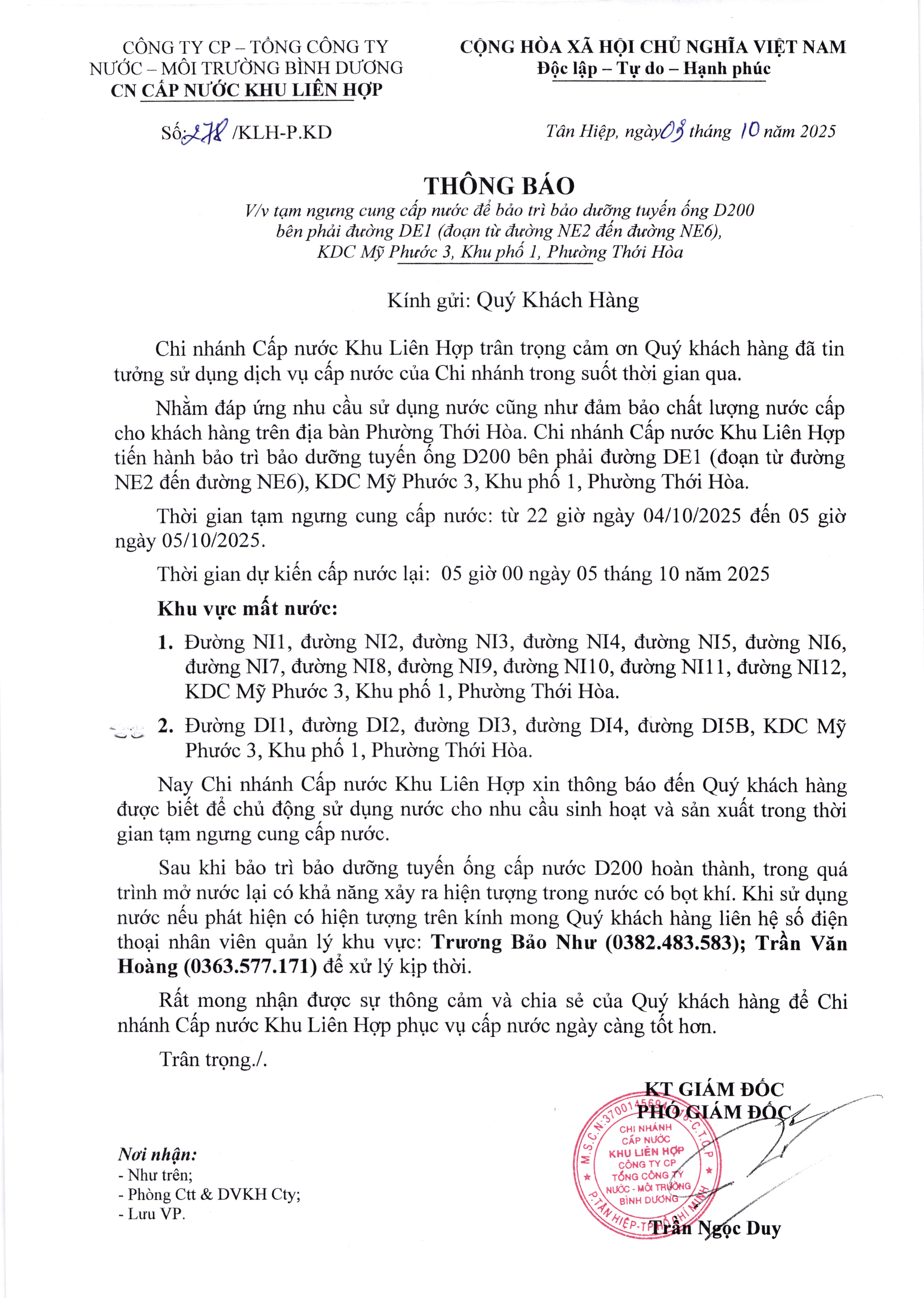 Tạm ngưng cung cấp nước khu vực Dĩ An : Hai bên đường ĐT747A đoạn từ ngã 4 Miễu Ông Cù đến cầu Ông Tiếp - KCN Chí Hùng - Đ.HL401, P. Thái Hòa. Hai bên Đ.ĐT747A đoạn từ ngã 3 Chợ Tân Ba đến trạm thu phí Khánh Bình - Khu TĐC Cảng Thạnh Phước, P. Thạnh Phước