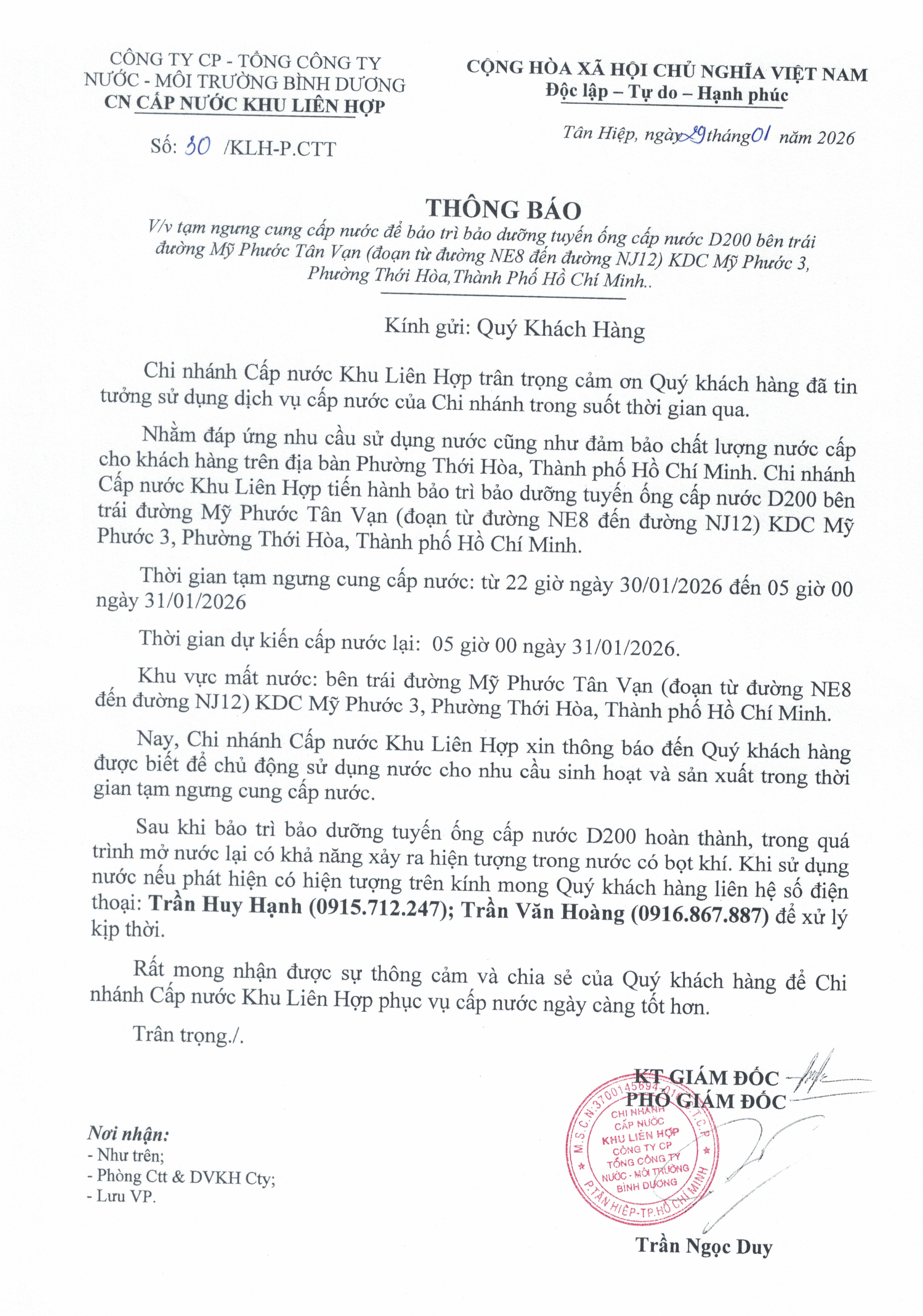 Tạm ngưng cấp nước khu vực Khu Liên Hợp: tuyến ống D100 bên trái đường Ngã ba Bến Lớn (đoạn từ đường Đại lộ Bình Dương đến Công ty An Hưng Tường), Kp.3, P.Hòa Lợi
