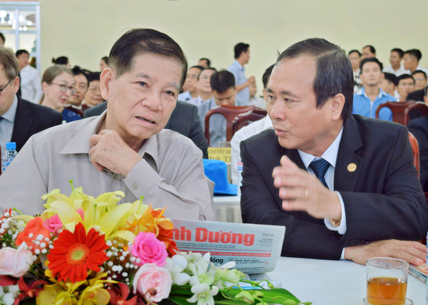 Photo 4: Mr. Nguyen Minh Triet–former President- listened to Mr. Tran Van Nam-Secretary of Binh Duong Provincial Party Committee- Team Leader of Parliamentary Delegation- reporting onenvironmental treatment carried out by BIWASE