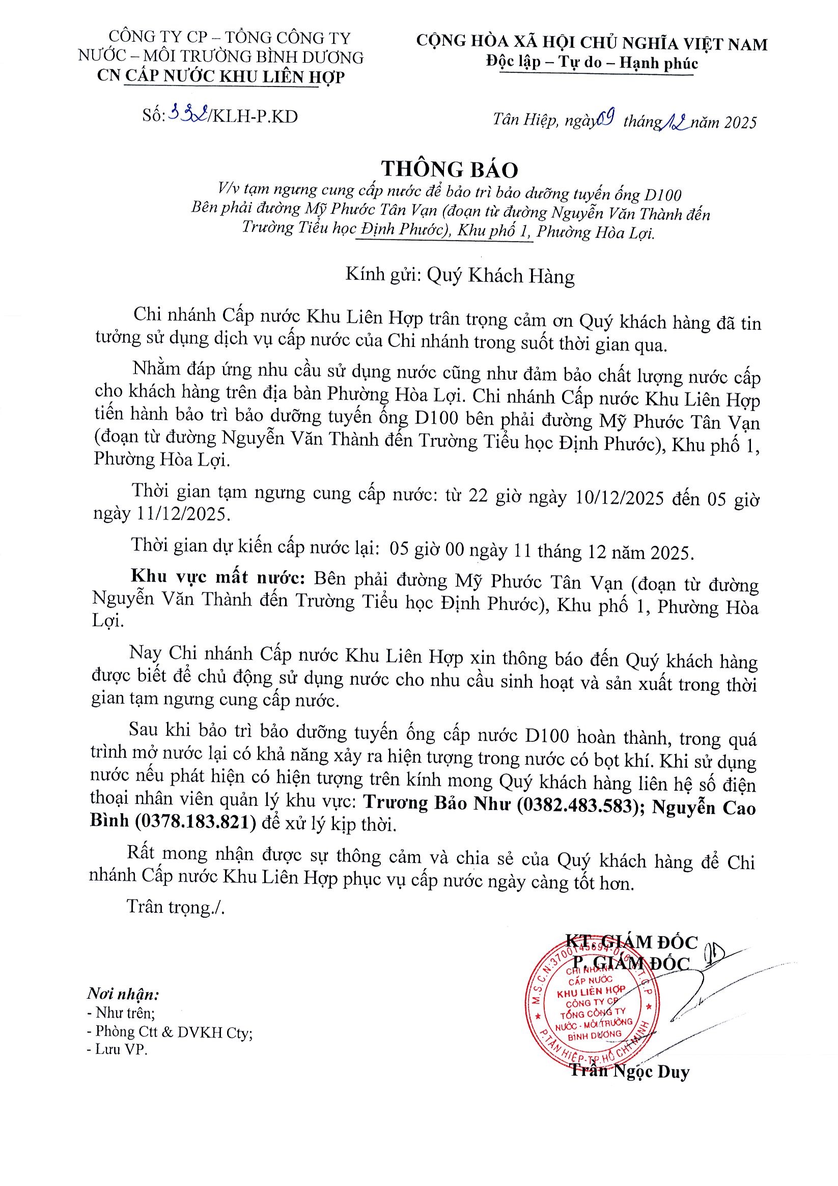 Tạm ngưng cấp nước khu vực Khu Liên Hợp: tuyến ống D100 bên phải đường Mỹ Phước Tân Vạn (đoạn từ đường Nguyễn Văn Thành đến Trường Tiểu học Định Phước), Kp.1, P.Hòa Lợi