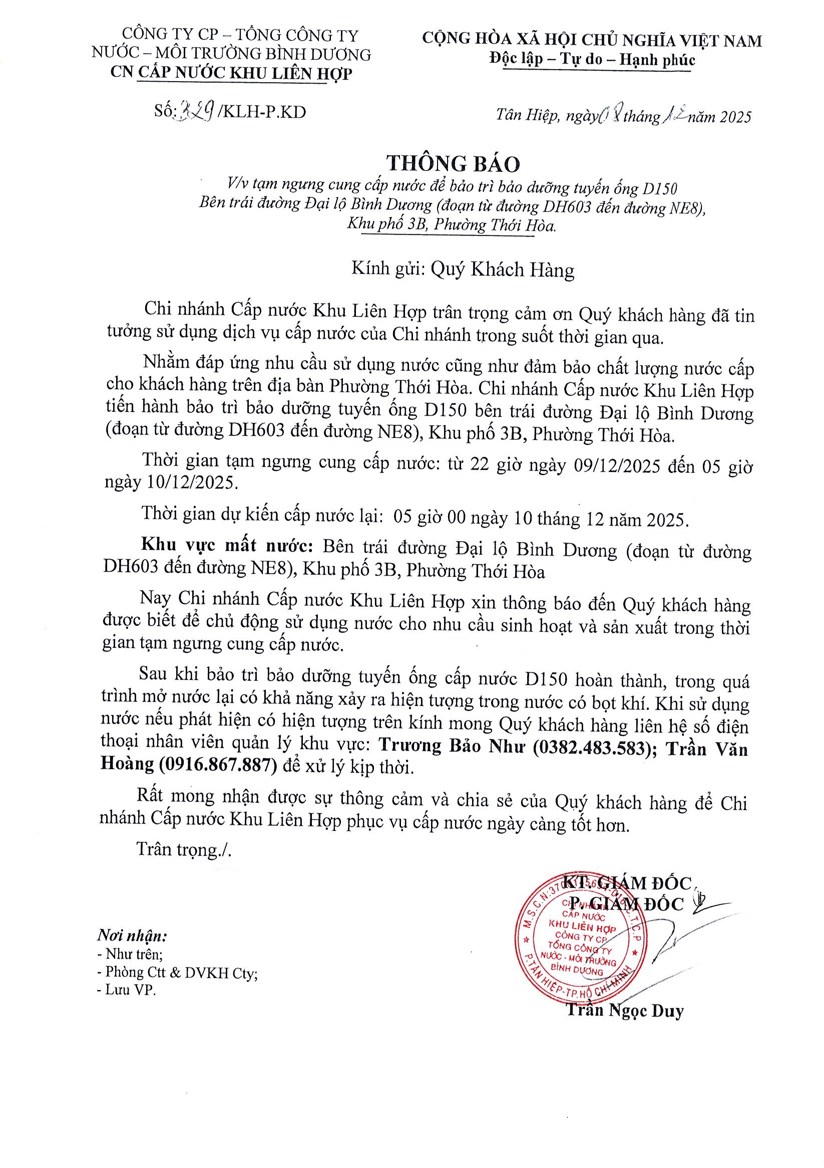 Tạm ngưng cấp nước khu vực Khu Liên Hợp: tuyến ống D150 bên trái đường Đại Lộ Bình Dương (đoạn từ đường DH603 đến đường NE8), Kp.3B, P.Thới Hòa