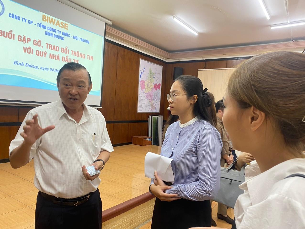 Ngày 4/8, lãnh đạo Công ty CP - Tổng công ty Nước - Môi trường Bình Dương đã có buổi gặp gỡ, cung cấp thông tin và trả lời các câu hỏi, thắc mắc của các nhà đầu tư.