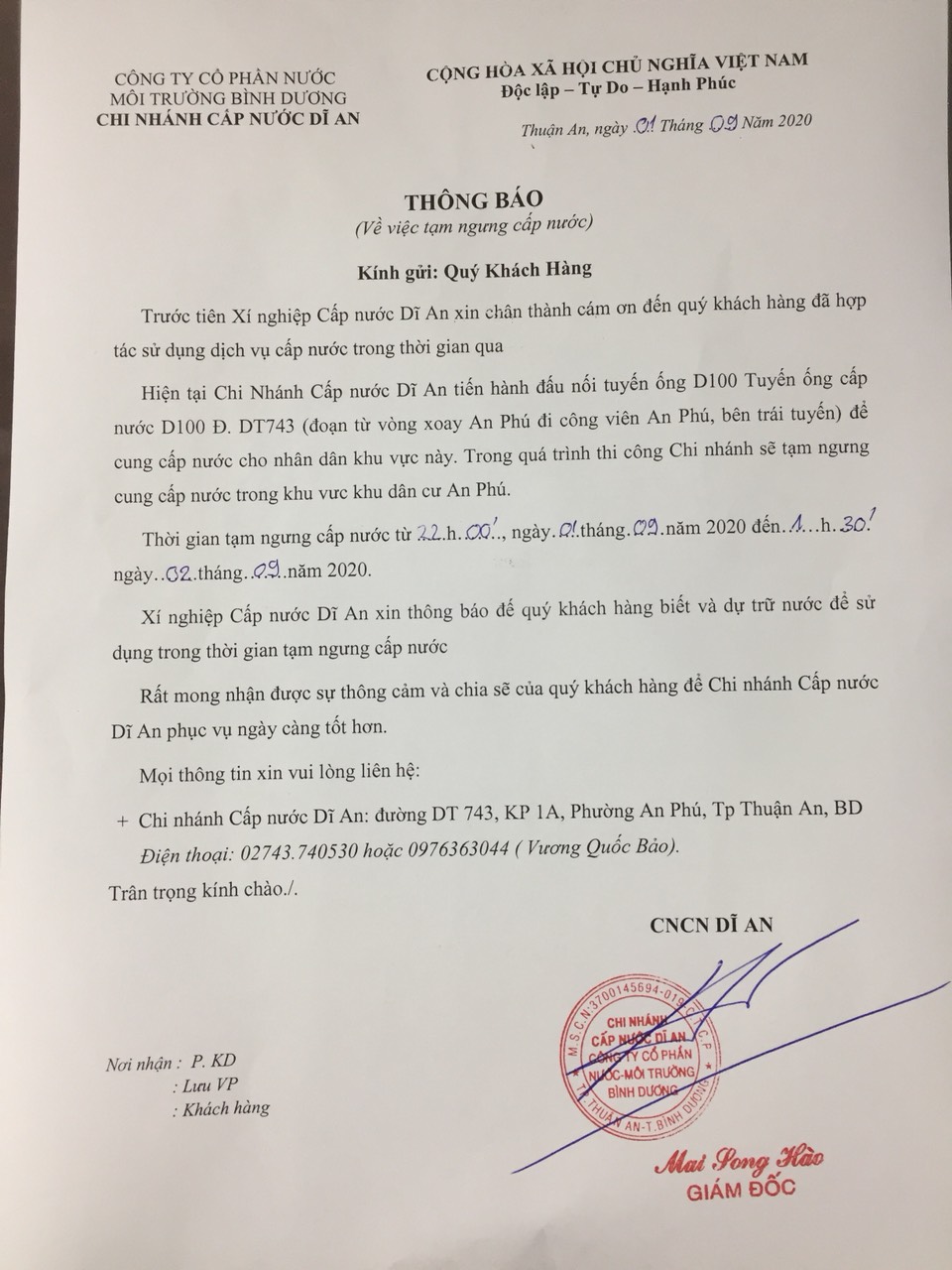 Tạm ngưng cấp nước khu vực Thuận An: tuyến ống cấp nước D400 đường Quốc Lộ 13, P.Bình Hòa
