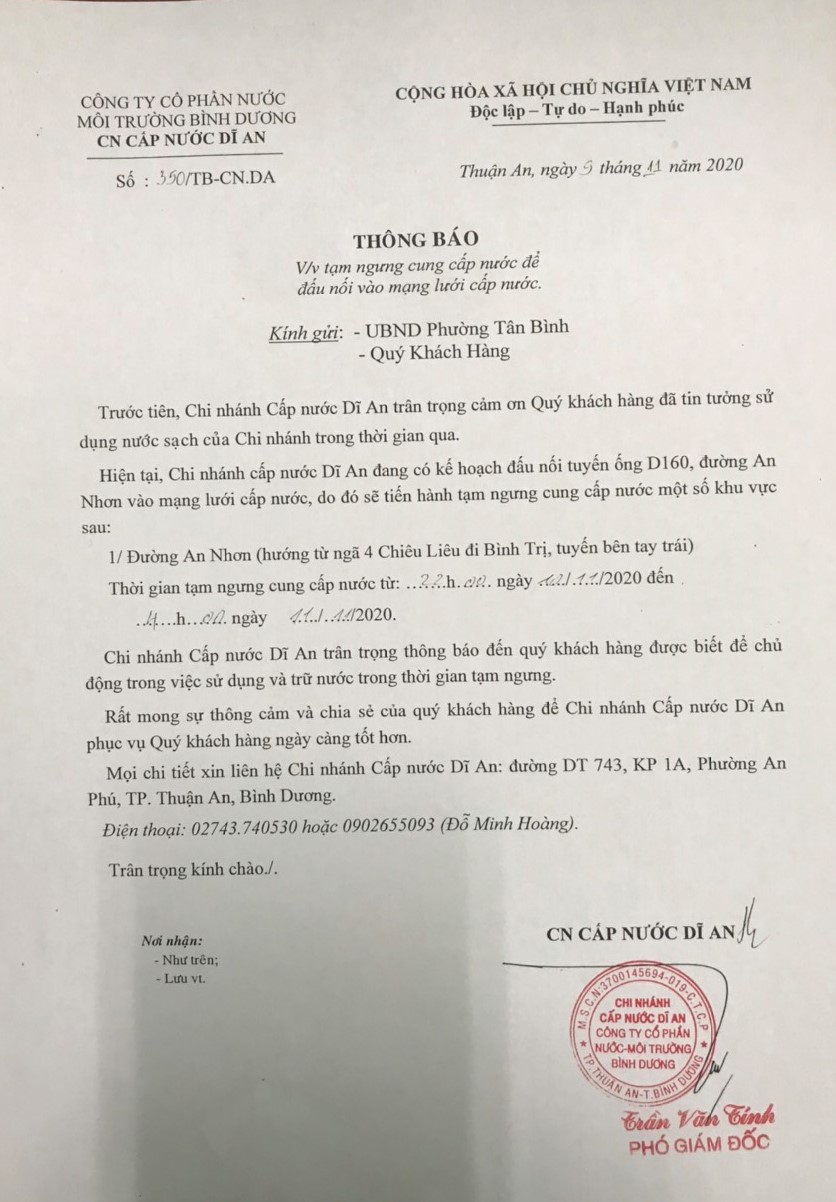 Tạm ngưng cấp nước khu vực Dĩ An: tuyến ống D200 P.Tân Khánh và P.An Phú