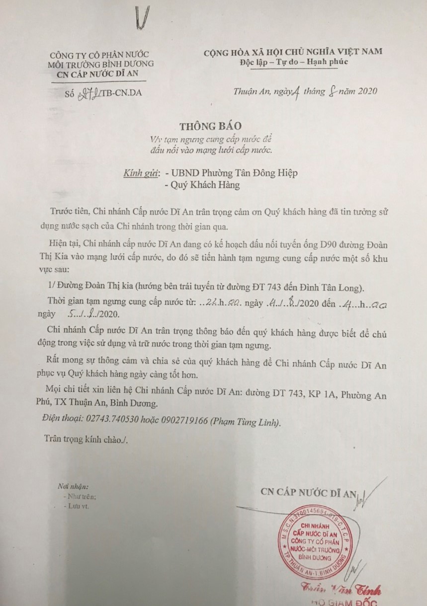 Tạm ngưng cung cấp nước đường Đoàn Thị Kia-Dĩ An