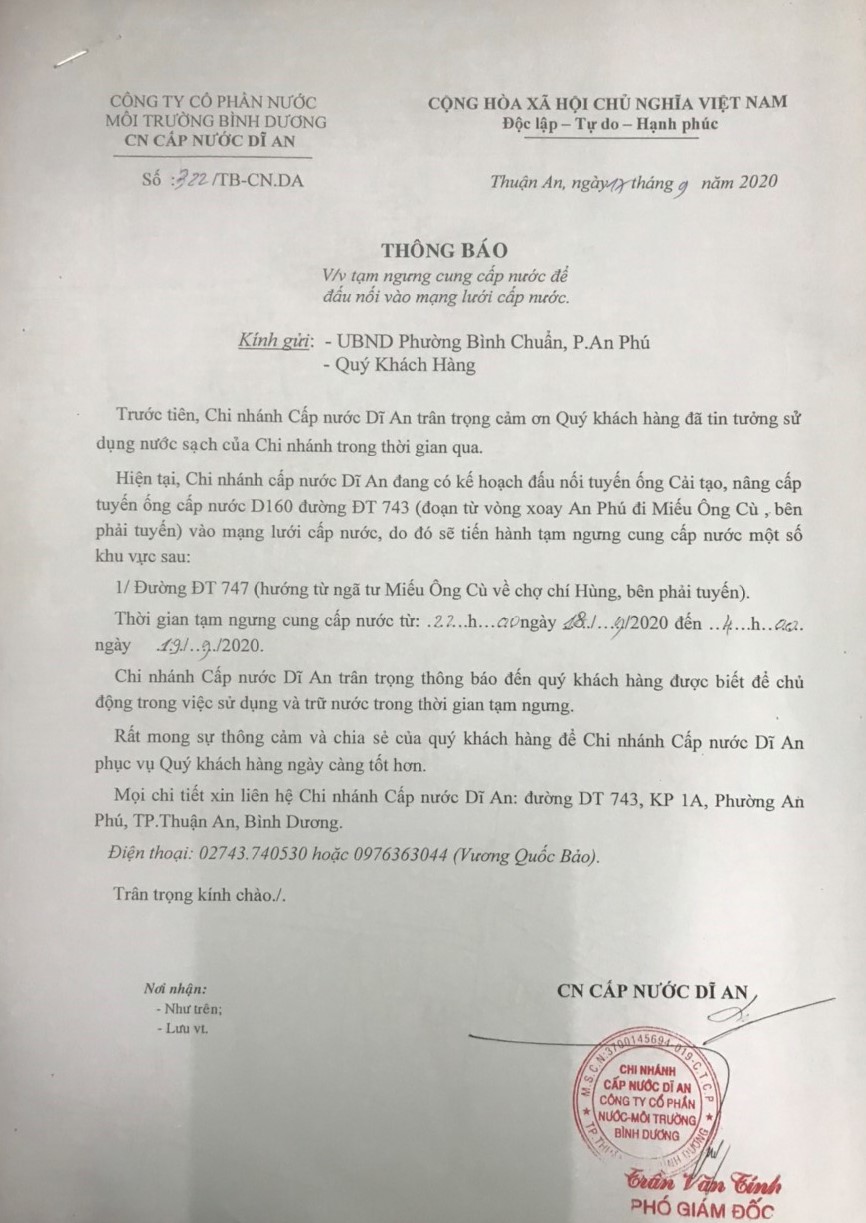 Tạm ngưng cấp nước khu vực Dĩ An: tuyến ống D200 P.Tân Khánh và P.An Phú