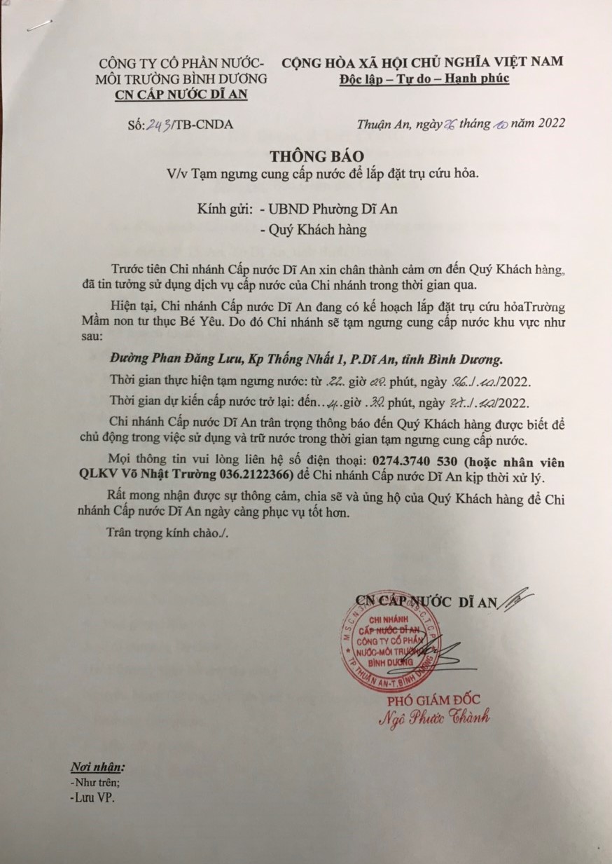 Tạm ngưng cung cấp nước Đường Phan Đăng Lưu, KP Thống Nhất, Dĩ An