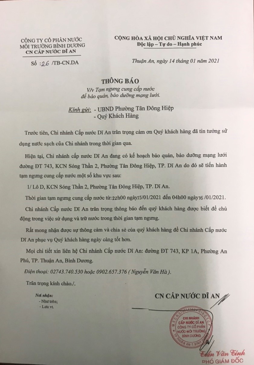 Tạm ngưng cấp nước khu vực Dĩ An: tuyến ống D200 P.Tân Khánh và P.An Phú