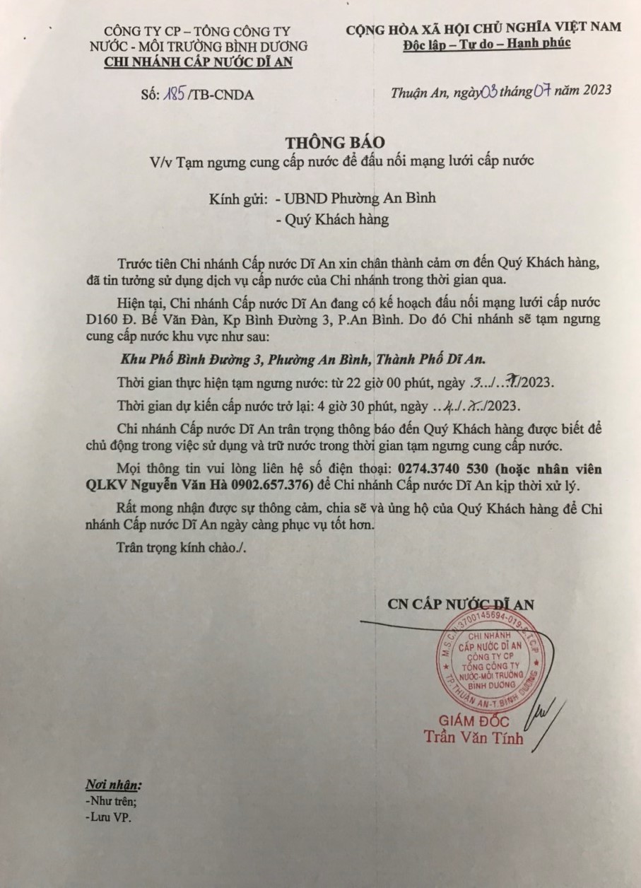 Tạm ngưng cấp nước khu vực Dĩ An: tuyến ống D200 P.Tân Khánh và P.An Phú