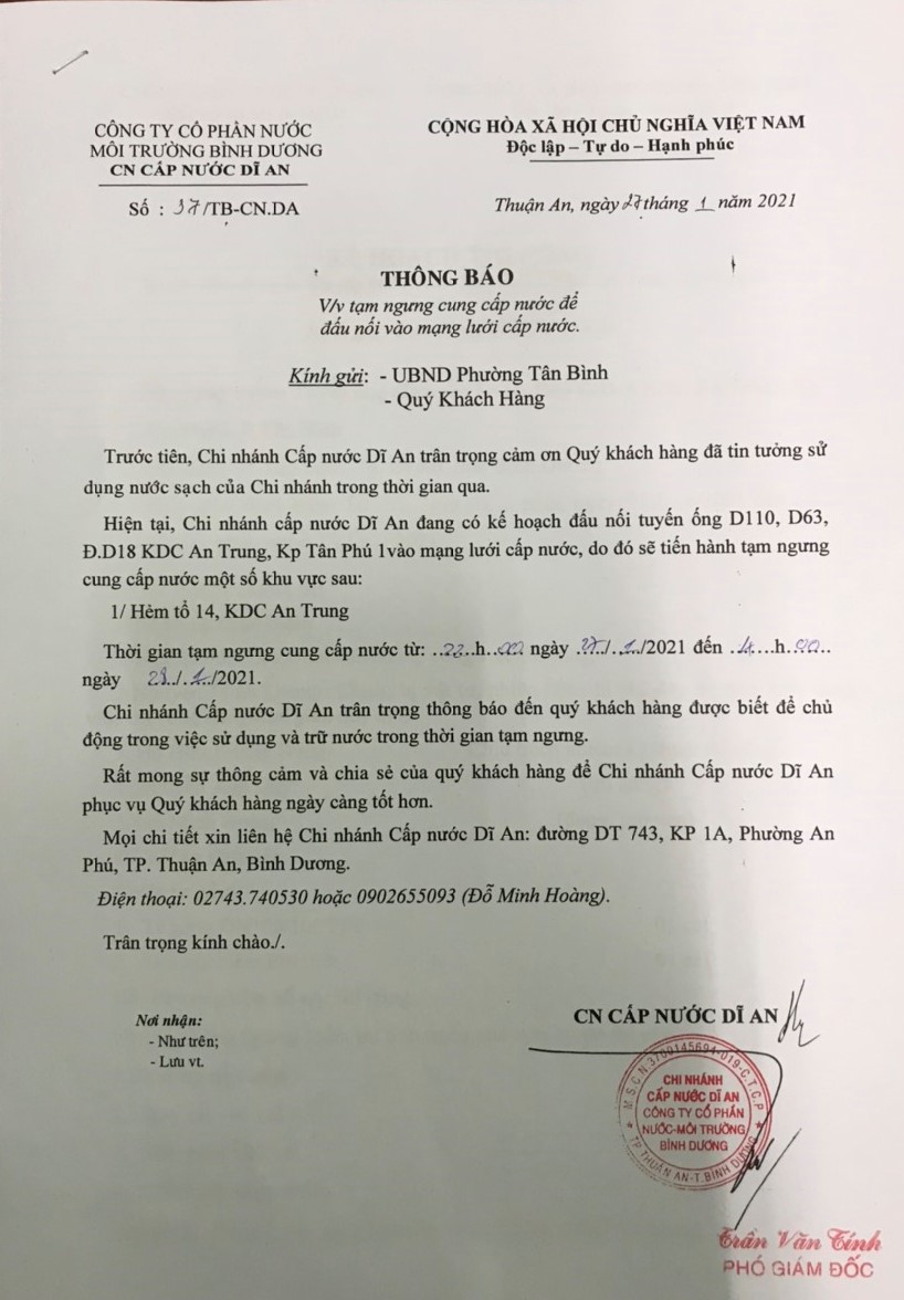 Tạm ngưng cấp nước khu vực Dĩ An: tuyến ống cấp nước HDPE D90 hẻm 152 Kp.Tân Hiệp, P.Tân Đông Hiệp,...