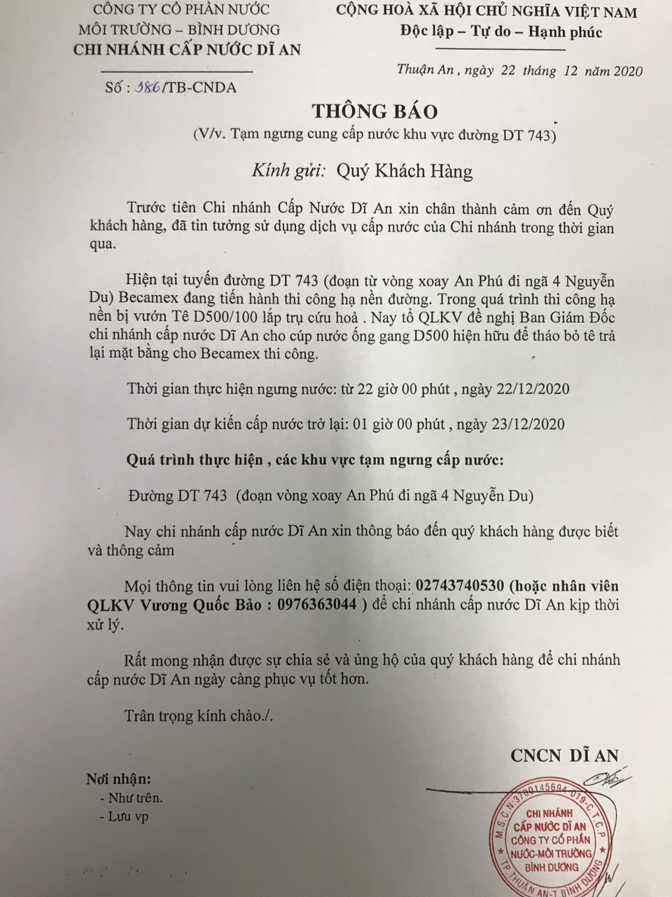 Tạm ngưng cấp nước khu vực Thuận An: tuyến ống cấp nước D400 đường Quốc Lộ 13, P.Bình Hòa