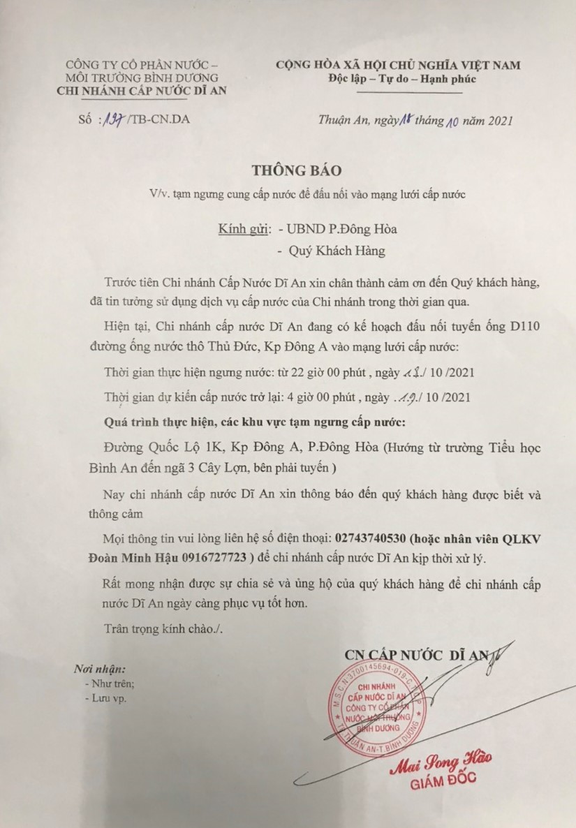 Tạm ngưng cấp nước khu vực Dĩ An: mạng lưới cấp nước tuyến ống D200 P. Tân Phước Khánh và P. An Phú