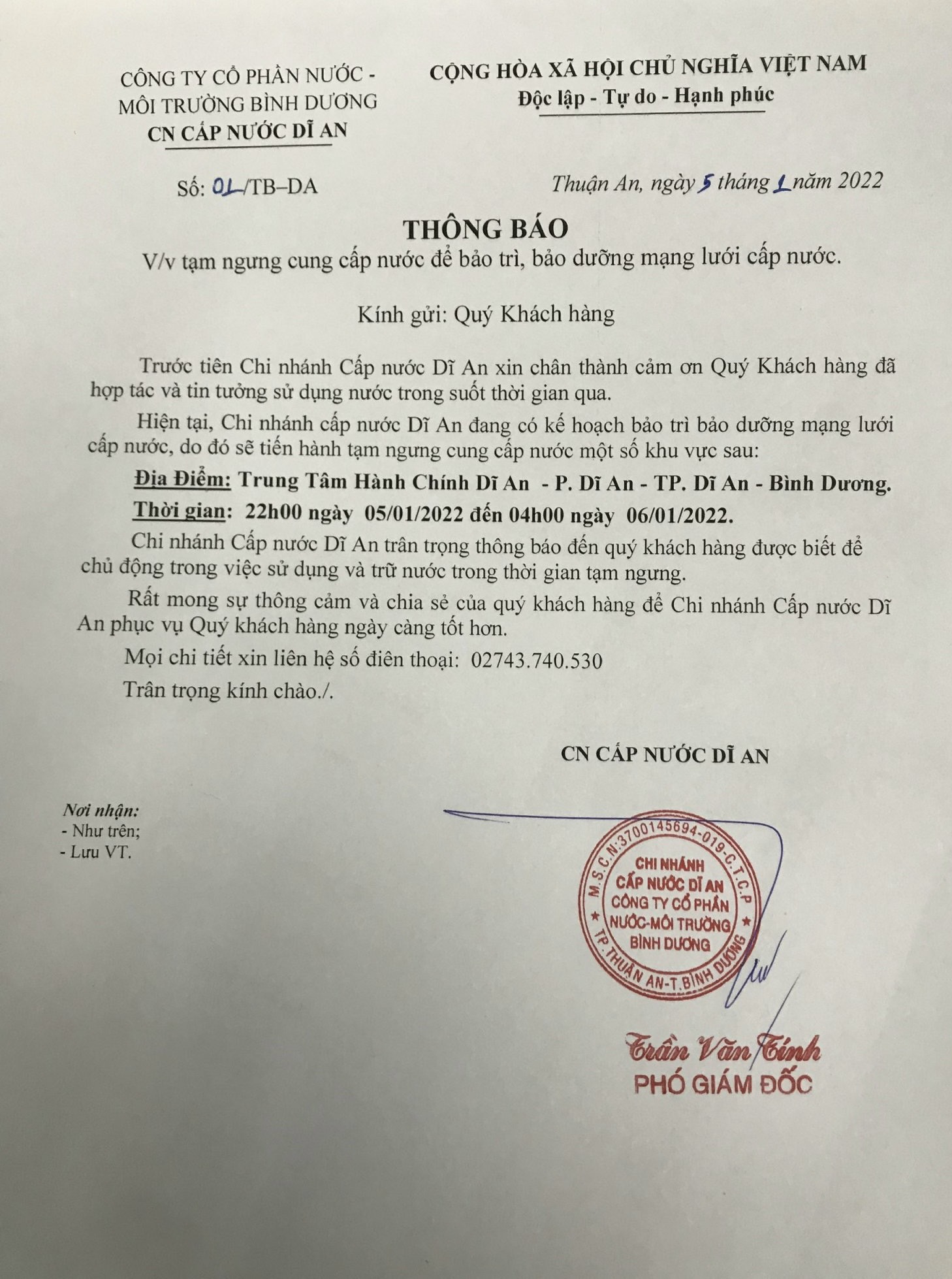 Tạm ngưng cấp nước khu vực Dĩ An: tuyến ống D200 P.Tân Khánh và P.An Phú