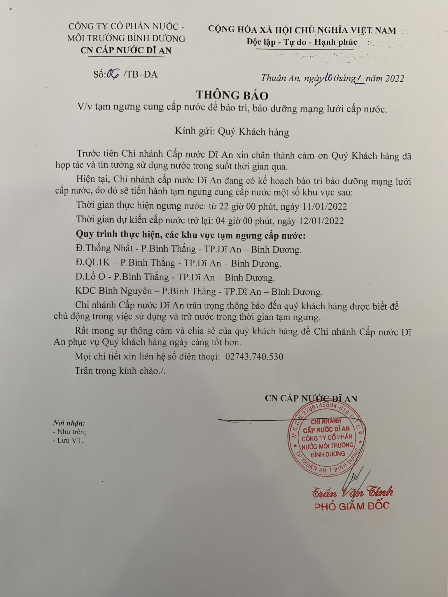 Tạm ngưng cấp nước khu vực Dĩ An: tuyến ống D200 P.Tân Khánh và P.An Phú