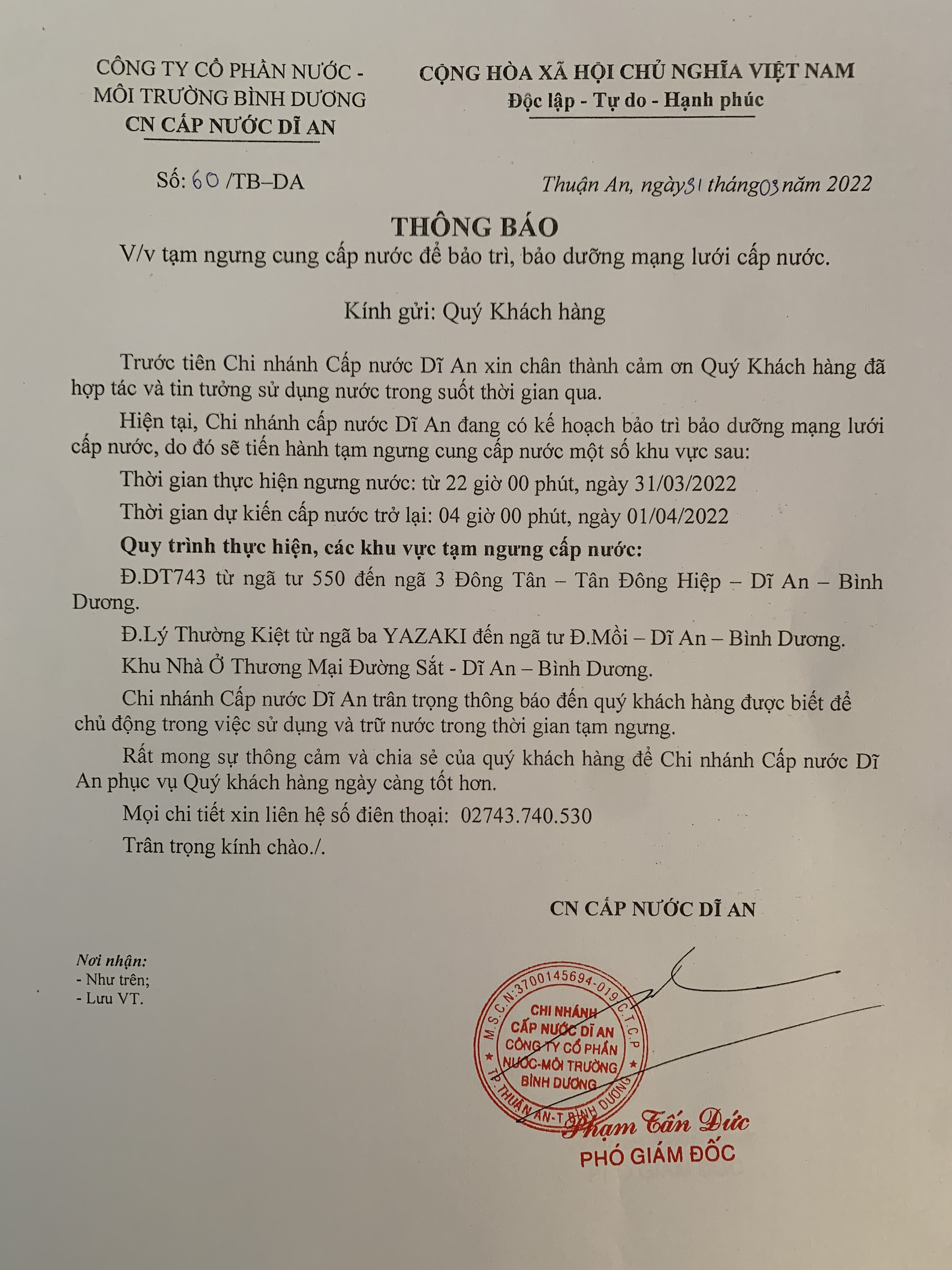 Tạm ngưng cấp nước khu vực Dĩ An: mạng lưới cấp nước tuyến ống D200 P. Tân Phước Khánh và P. An Phú