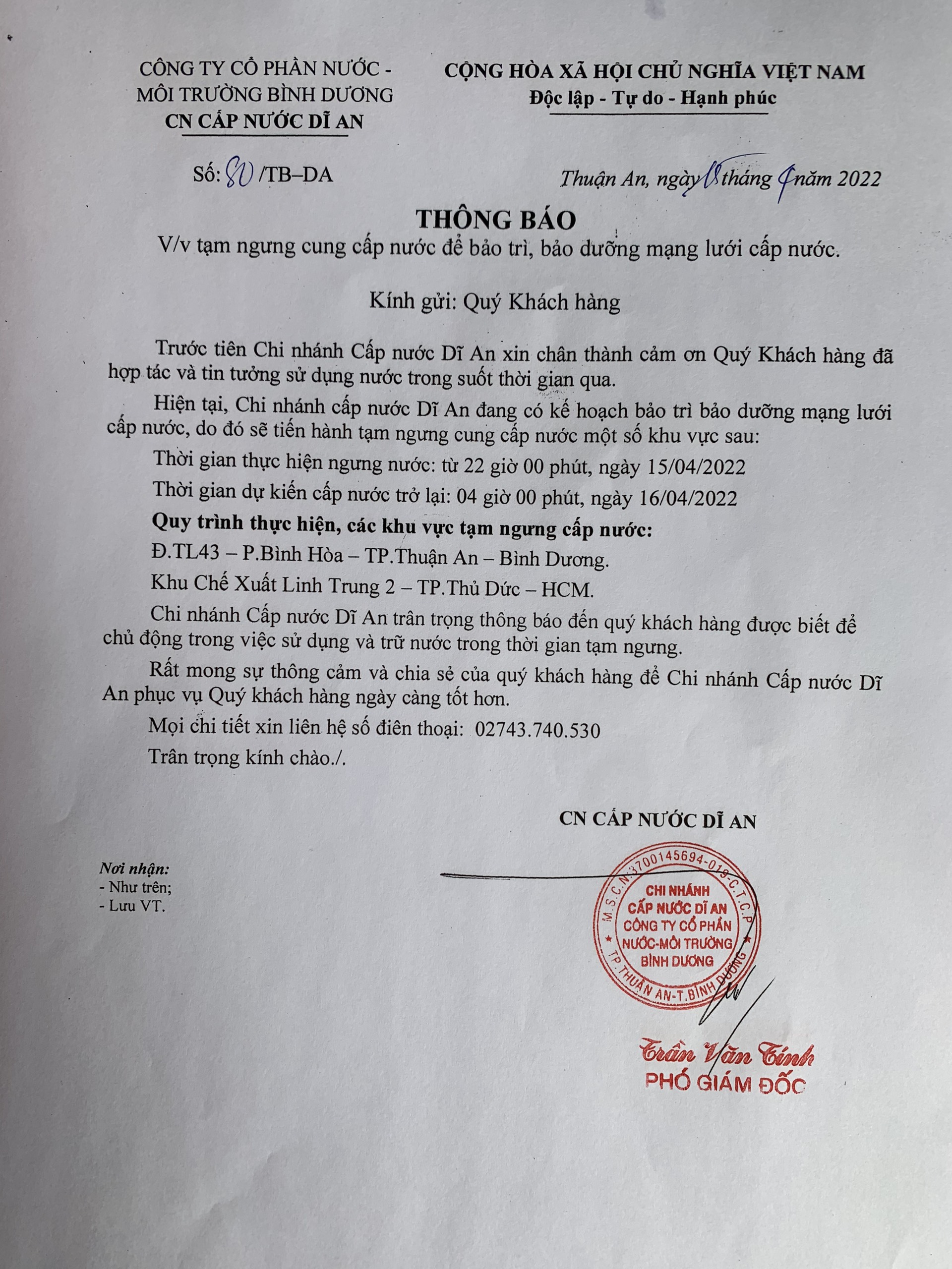Tạm ngưng cấp nước khu vực Dĩ An: mạng lưới cấp nước tuyến ống D200 P. Tân Phước Khánh và P. An Phú
