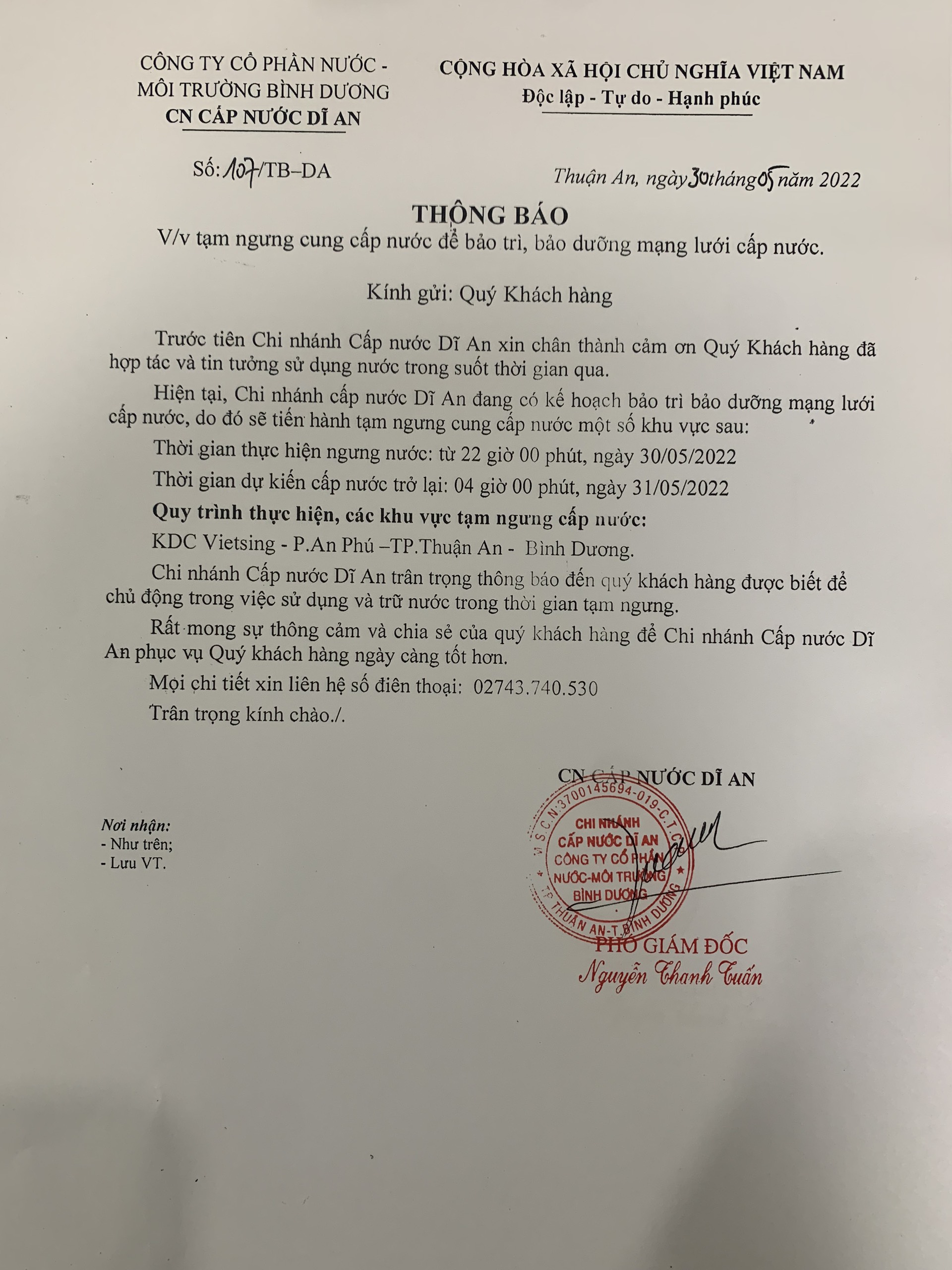 Tạm ngưng cấp nước khu vực Khu Liên Hợp: tuyến ống D150 bên phải đường Đại Lộ Bình Dương (đoạn từ...