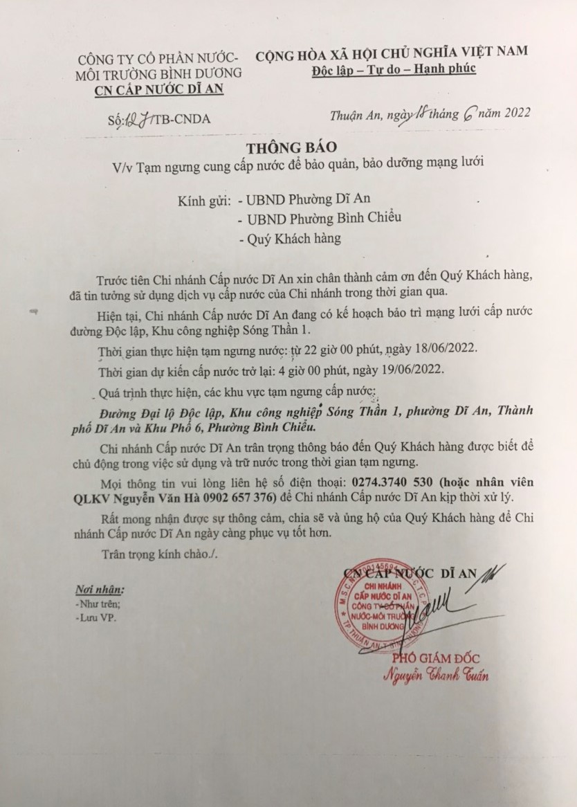 Tạm ngưng cấp nước khu vực Dĩ An: tuyến ống D200 P.Tân Khánh và P.An Phú