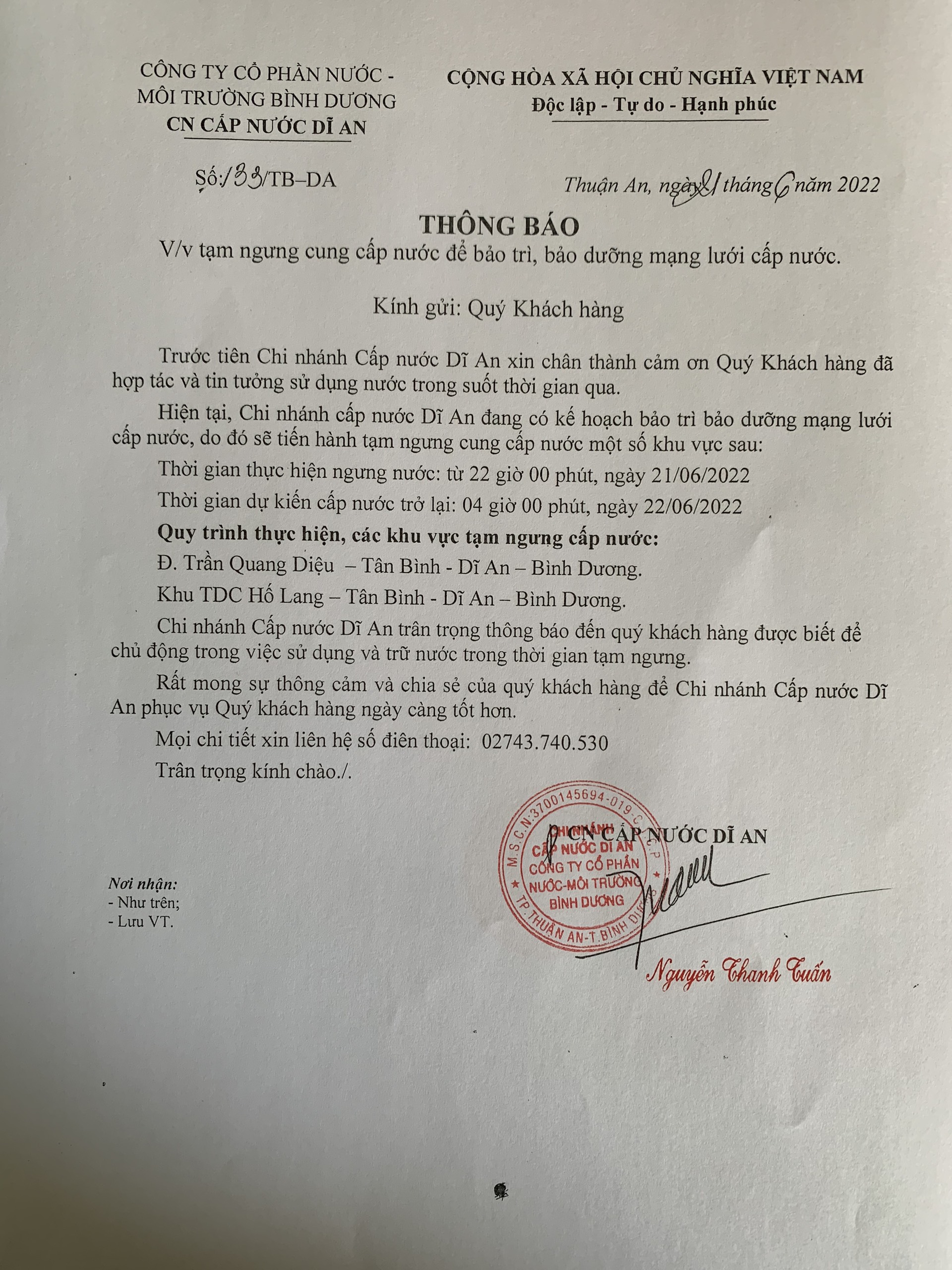 Tạm ngưng cấp nước khu vực Dĩ An: mạng lưới cấp nước tuyến ống D200 P. Tân Phước Khánh và P. An Phú