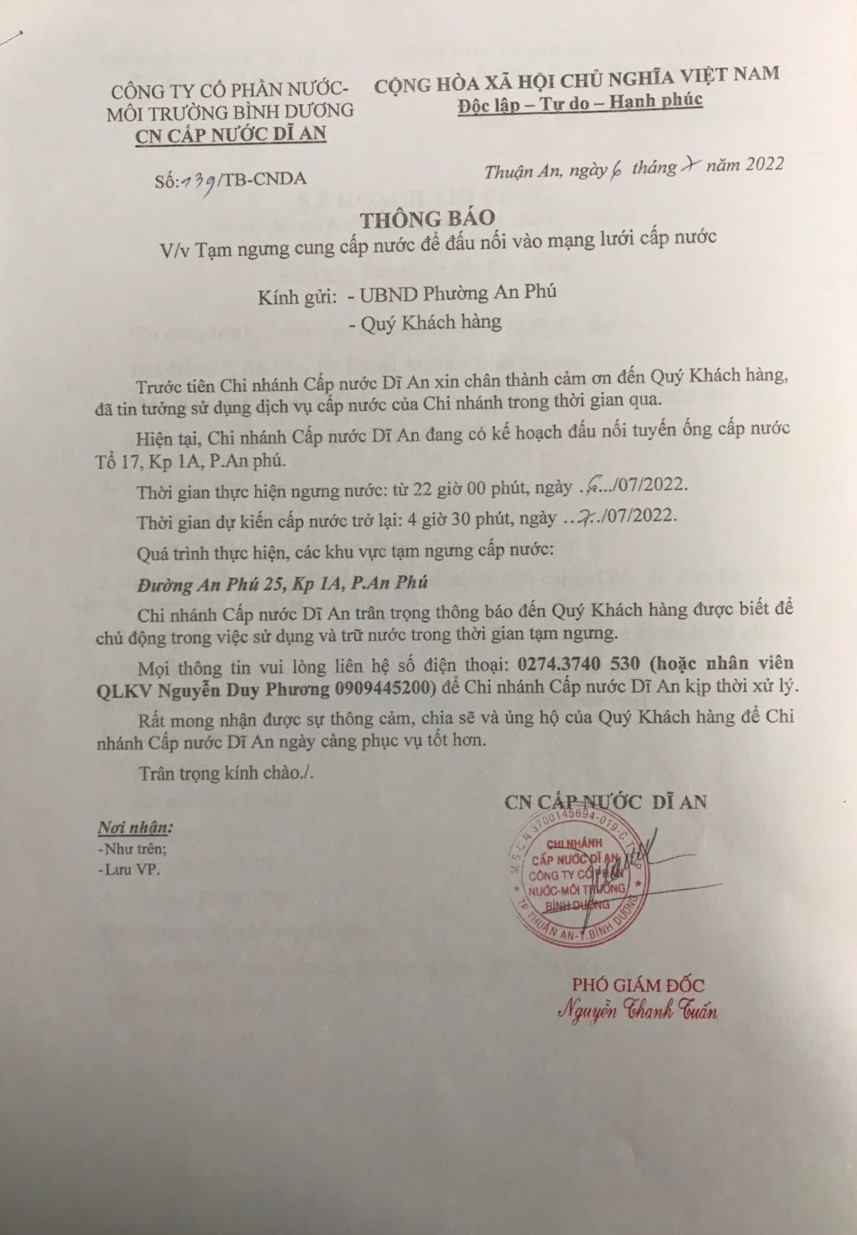 Tạm ngưng cấp nước khu vực Dĩ An: tuyến ống D200 P.Tân Khánh và P.An Phú