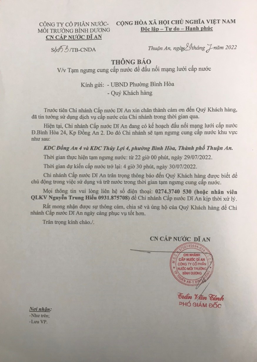 Tạm ngưng cấp nước khu vực Dĩ An: mạng lưới cấp nước tuyến ống D200 P. Tân Phước Khánh và P. An Phú