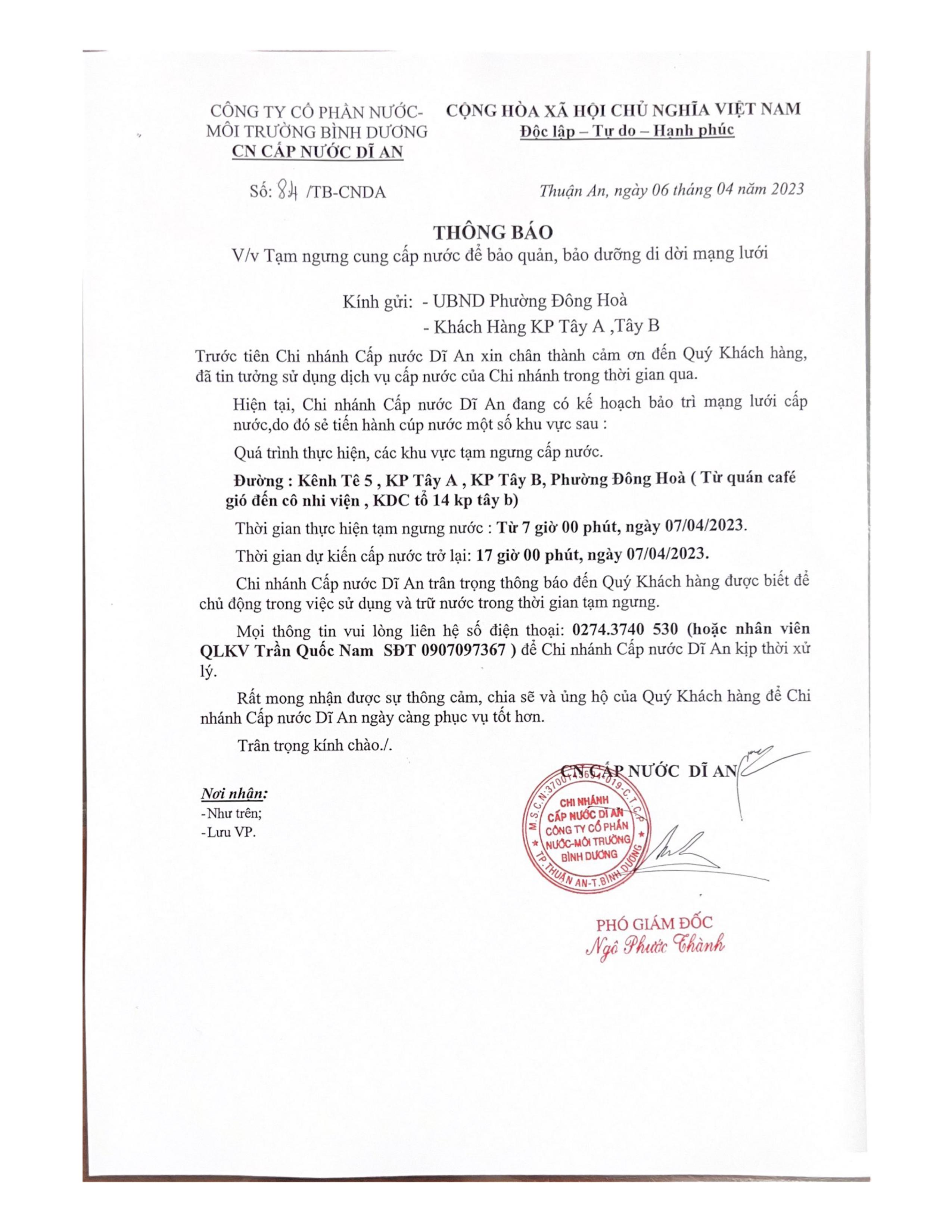 Tạm ngưng cấp nước khu vực Dĩ An: tuyến ống D200 P.Tân Khánh và P.An Phú