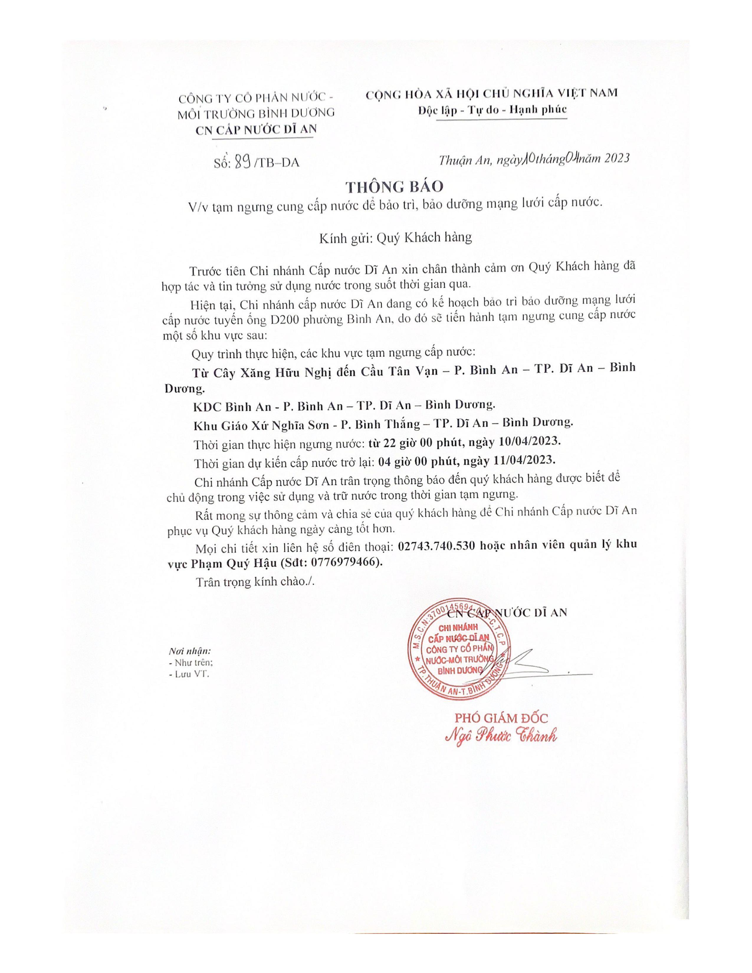 Tạm ngưng cấp nước khu vực Dĩ An: tuyến ống D200 P.Tân Khánh và P.An Phú