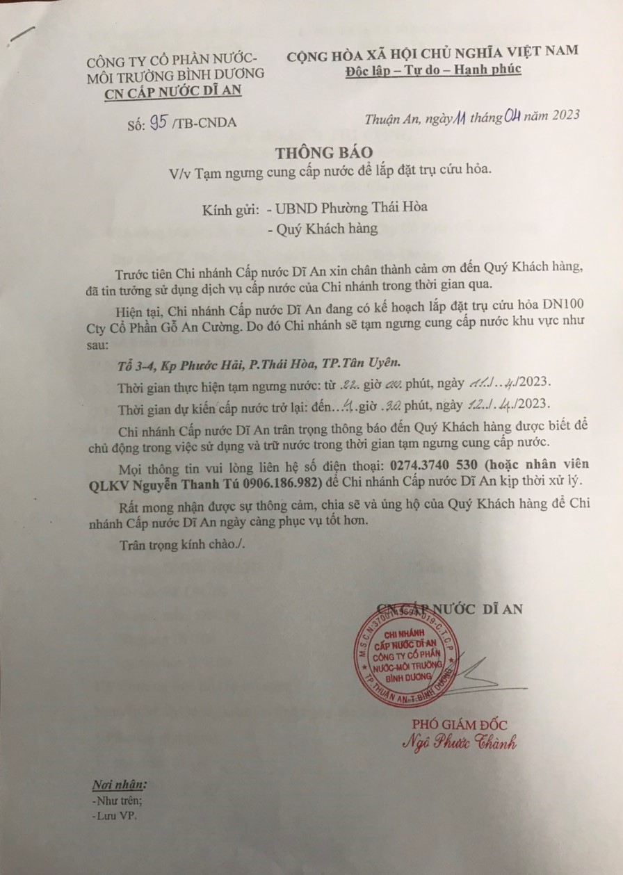 Tạm ngưng cấp nước khu vực Dĩ An: tuyến ống D200 P.Tân Khánh và P.An Phú