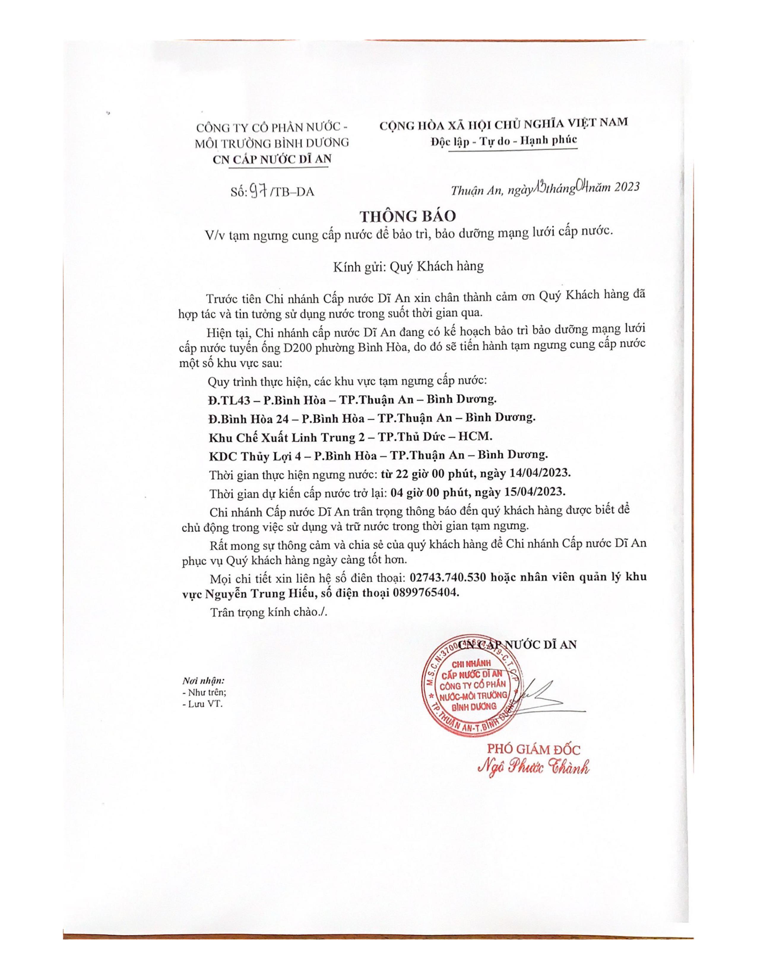 Tạm ngưng cấp nước khu vực Khu Liên Hợp: tuyến ống D150 bên phải đường Đại Lộ Bình Dương (đoạn từ...