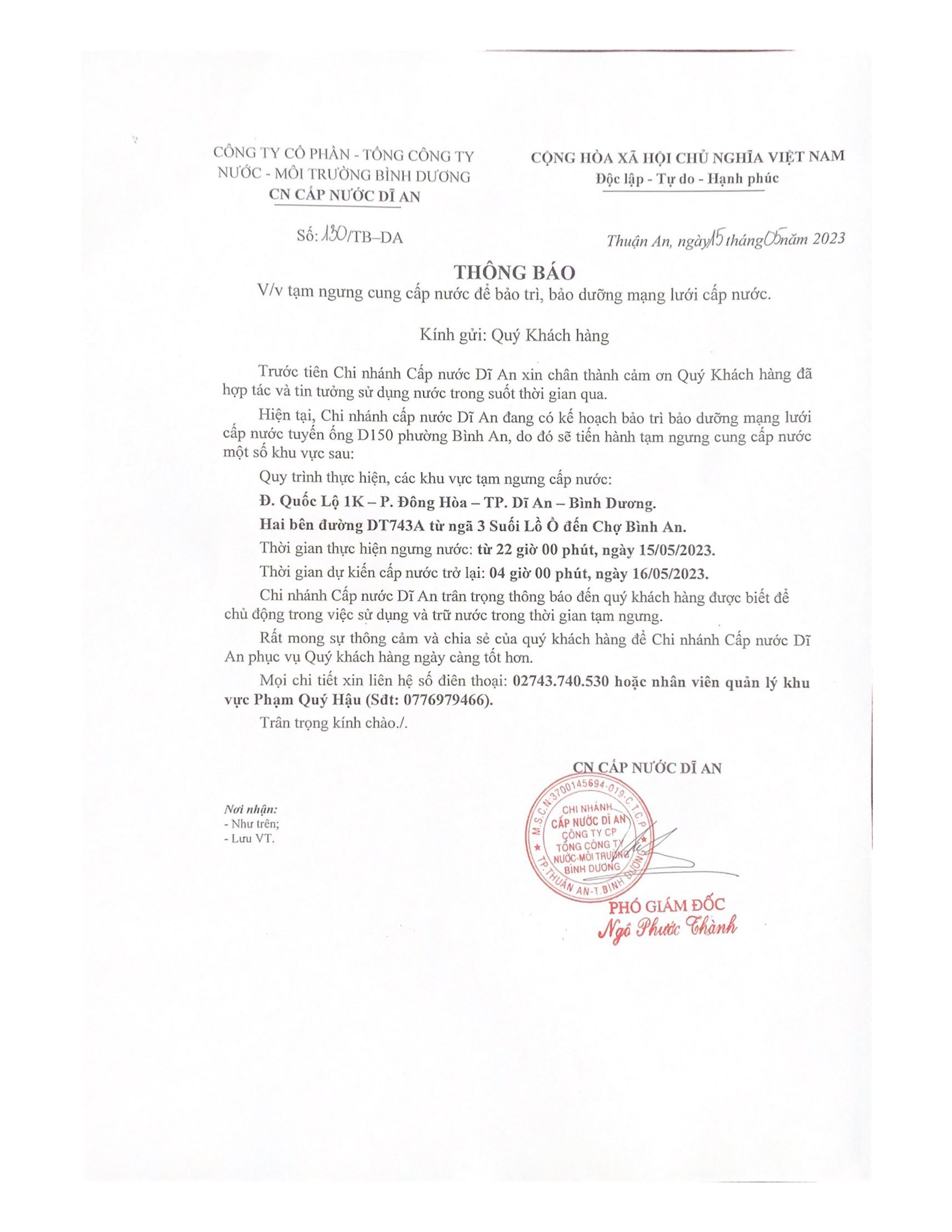 Tạm ngưng cấp nước khu vực Thuận An: tuyến ống cấp nước D400 đường Quốc Lộ 13, P.Bình Hòa