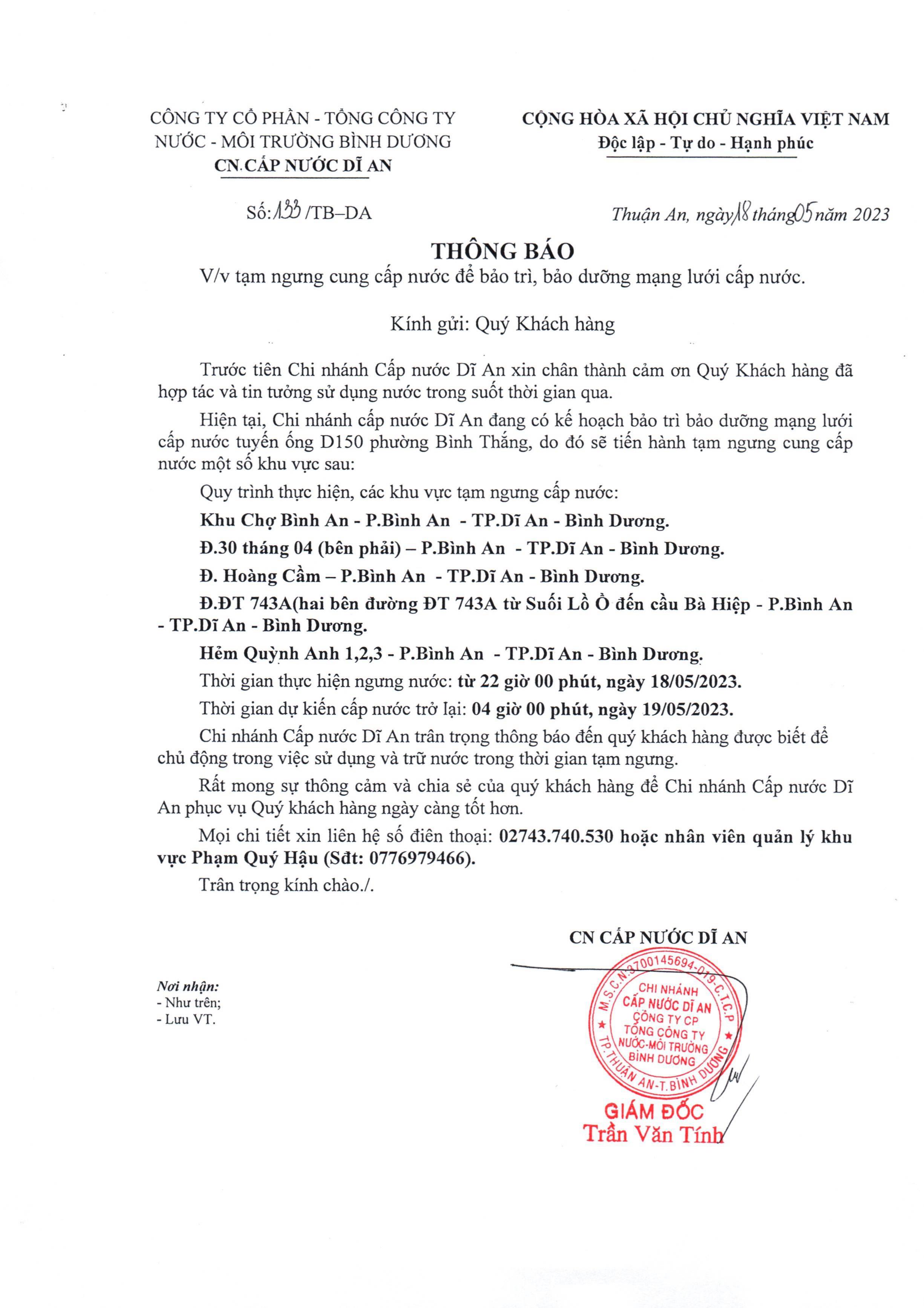 Tạm ngưng cấp nước khu vực Khu Liên Hợp: tuyến ống D150 bên phải đường Đại Lộ Bình Dương (đoạn từ...