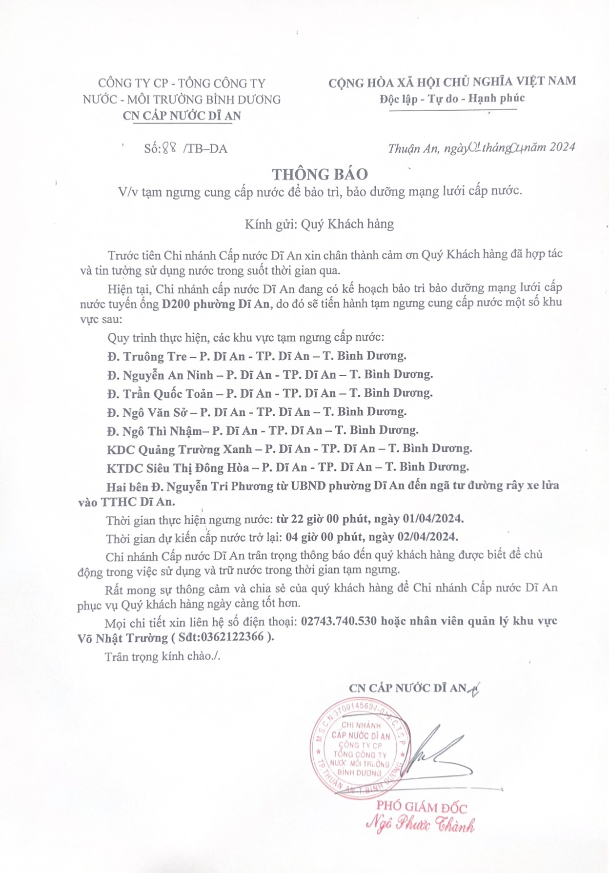 Tạm ngưng cung cấp nước khu vực Dĩ An : Các tuyến đường Phường Dĩ An-TP. Dĩ An- Tỉnh Bình Dương.