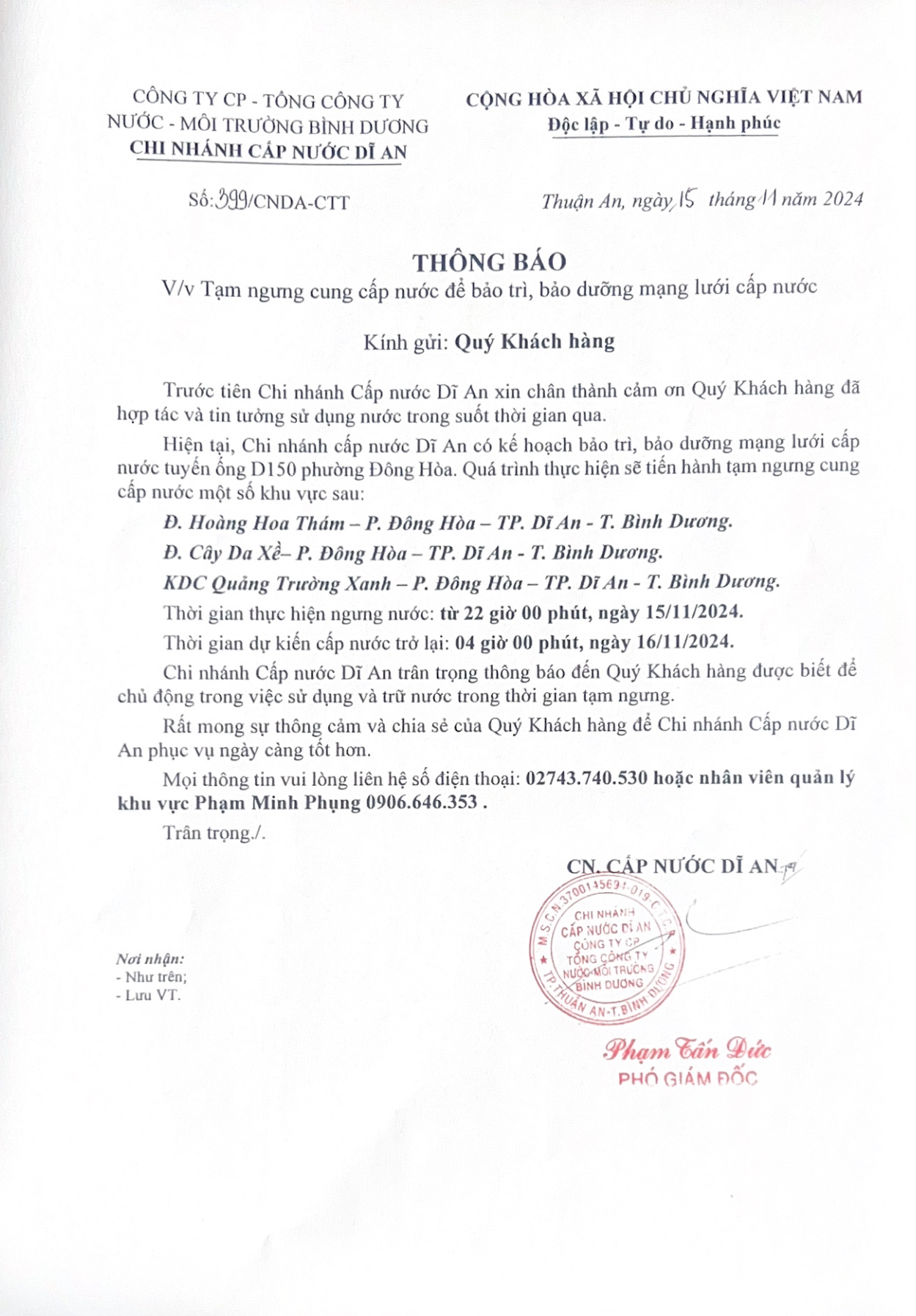 Tạm ngưng cung cấp nước khu vực Dĩ An : Đ. Hoàng Hoa Thám - Đ. Cây Da Xề - KDC Quảng Trường Xanh, P. Đông Hòa, TP. Dĩ An, Tỉnh Bình Dương