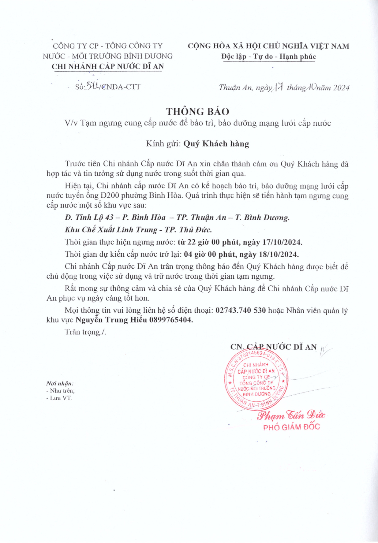 Tạm ngưng cung cấp nước khu vực Dĩ An : Đ. Tỉnh Lộ 43, P. Bình Hòa, TP. Thuận An, BD. Khu Chế Xuất Linh Trung, TP. Thủ Đức