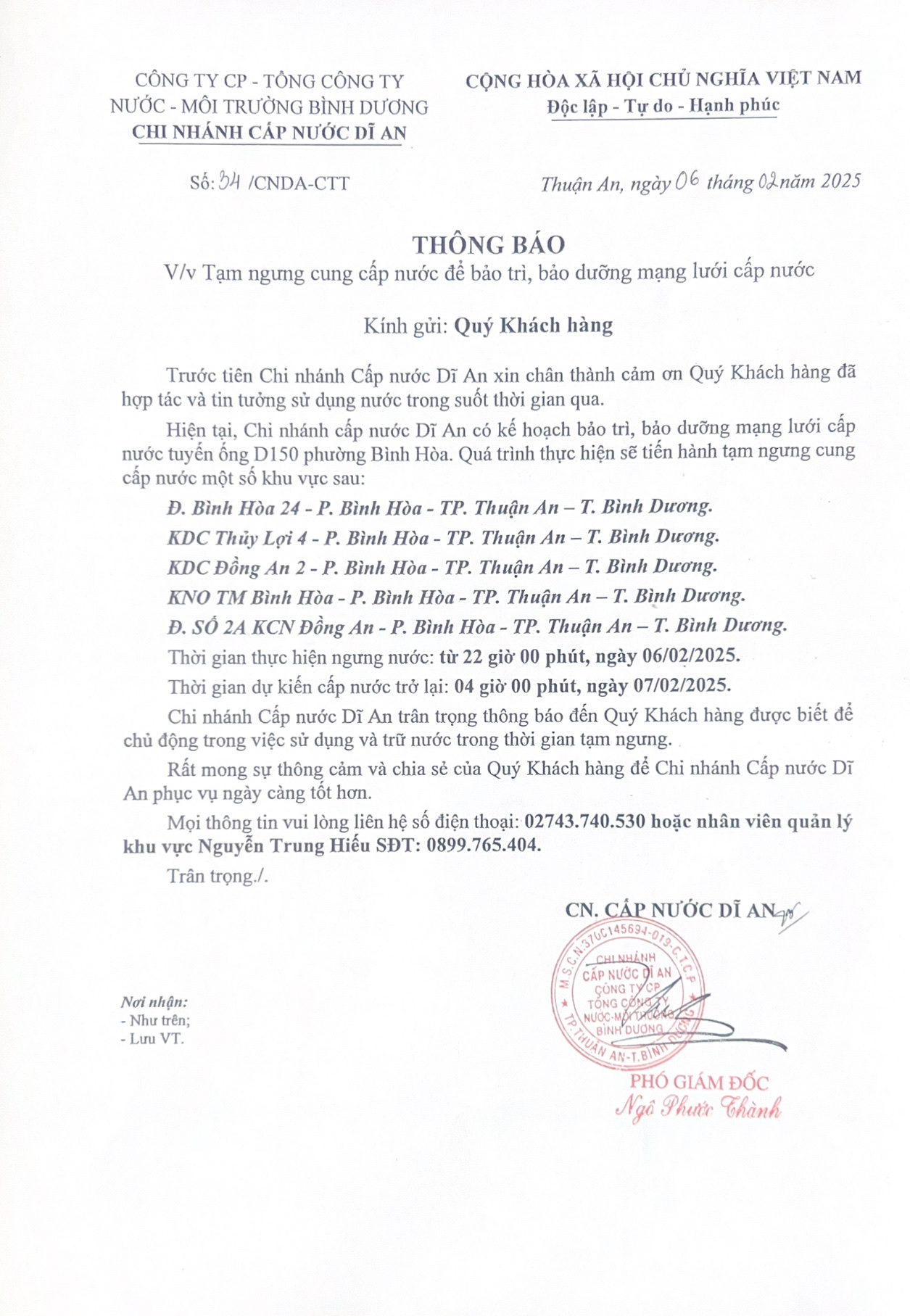 Tạm ngưng cung cấp nước khu vực Dĩ An : Đ. Bình Hòa 24 - KDC Thủy Lợi 4 - KDC Đồng An 2 - KNO TM Bình Hòa - Đ. SỐ 2A KCN Đồng An, P. Bình Hòa, TP. Thuận An, Tỉnh Bình Dương