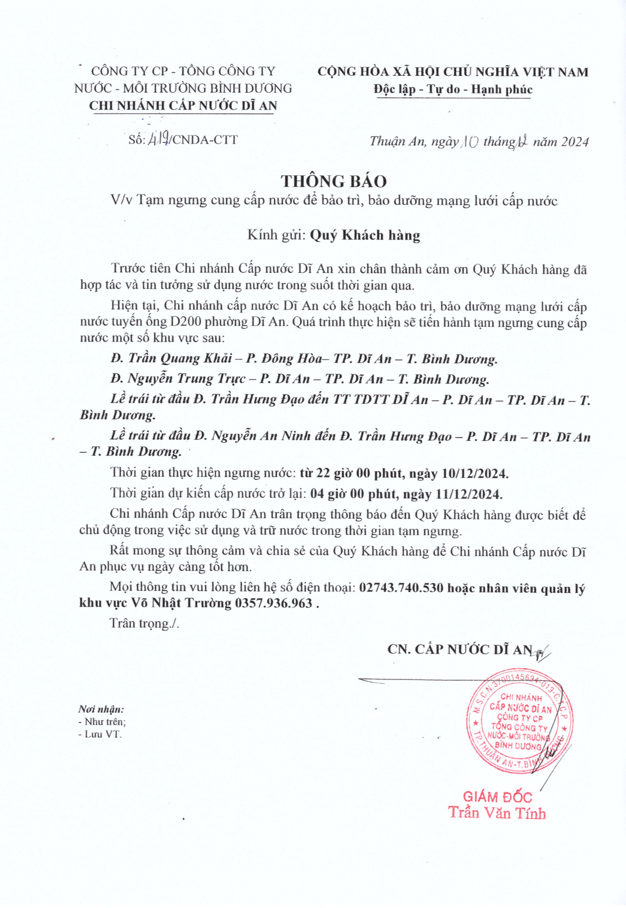Tạm ngưng cung cấp nước khu vực Dĩ An : Đ.Trần Quang Khải, P. Đông Hòa, TP. Dĩ An. Đ.Nguyễn Trung Trực, Đ. Trần Hưng Đạo đến TT TDTT Dĩ An, Đ. Nguyễn An Ninh đến Đ. Trần Hưng Đạo, P. Dĩ An, TP. Dĩ An, BD