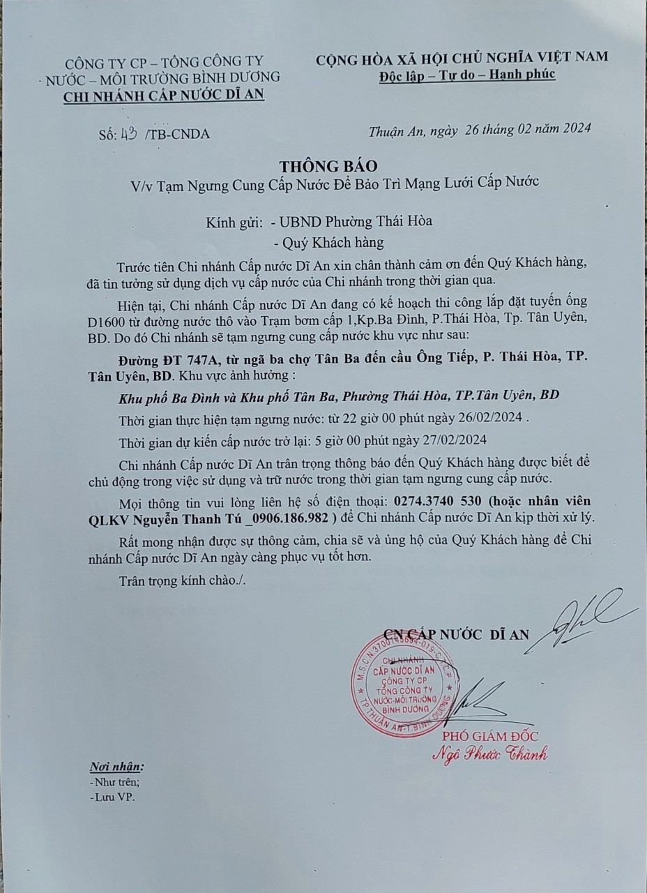 Tạm ngưng cung cấp nước khu vực Dĩ An : Đường ĐT 747A, từ ngã ba chợ Tân Ba đến Cầu Ông Tiếp, Phường Thái Hòa, TP. Tân Uyên, BD