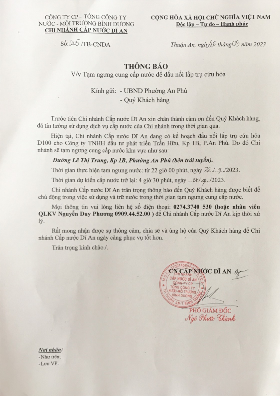 Tạm ngưng cung cấp nước khu vực Dĩ An: đường Lê Thị Trung, Kp 1B, P.An Phú