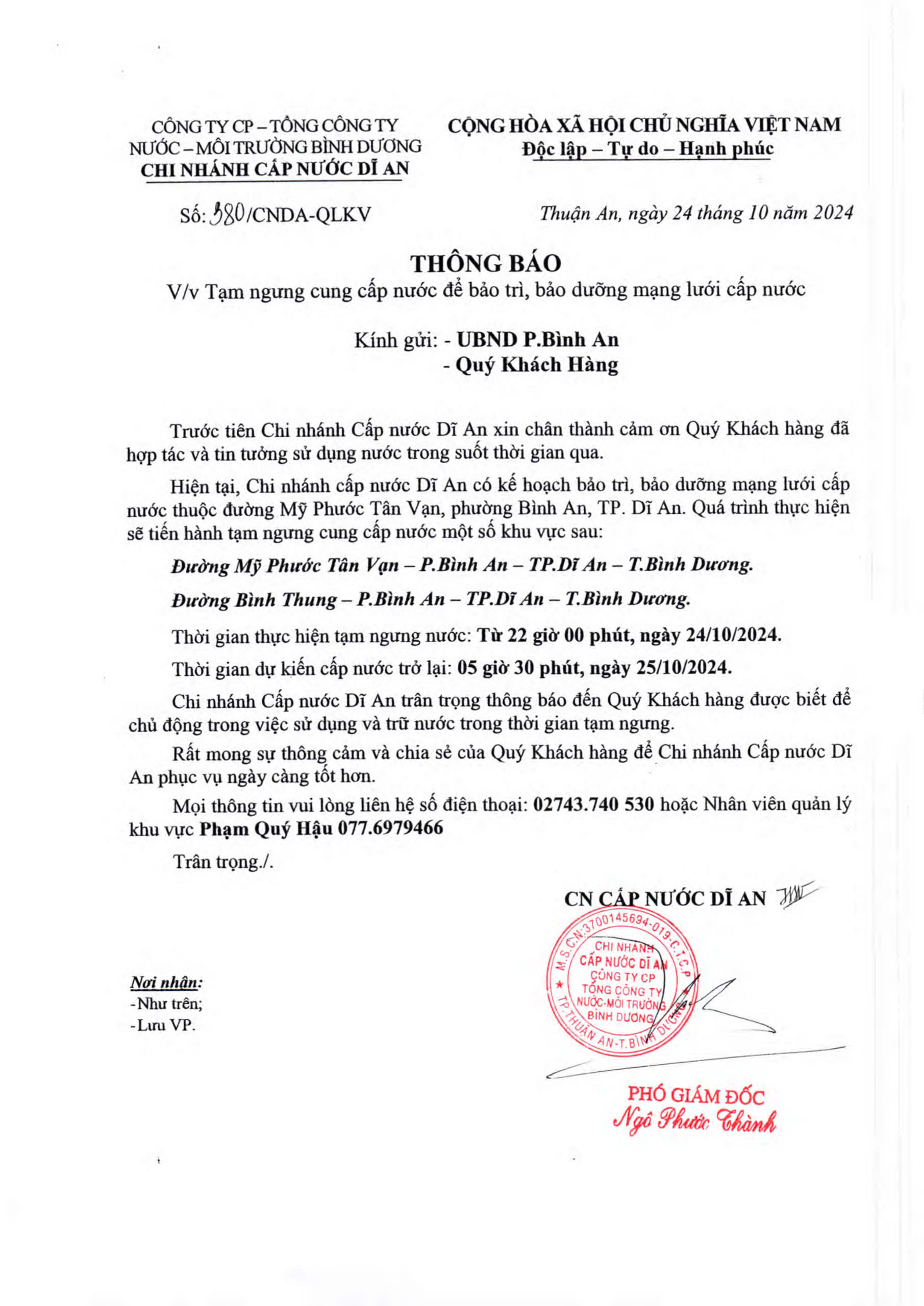 Tạm ngưng cung cấp nước khu vực Dĩ An : Đường Mỹ Phước Tân Vạn & Đường Bình Thung, P. Bình An, TP. Dĩ An, Tỉnh BD