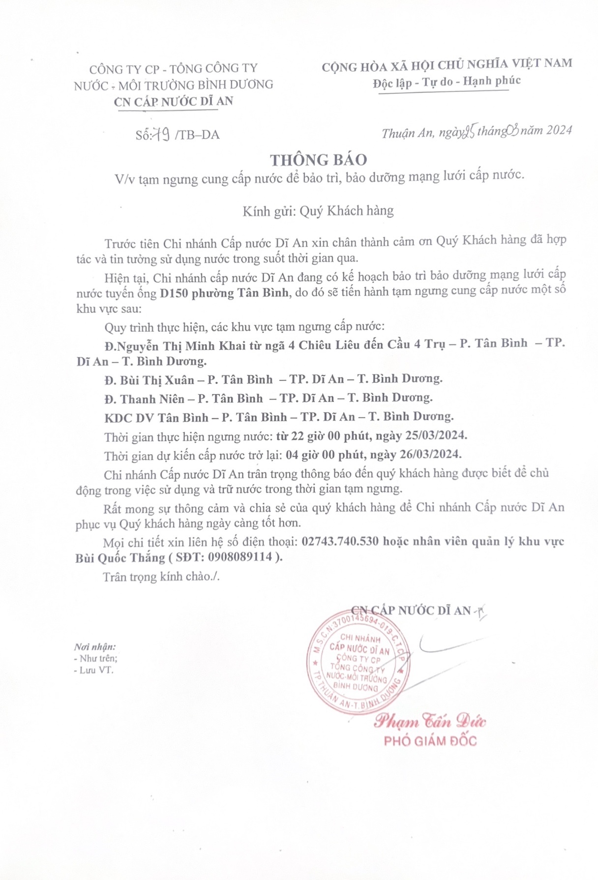 Tạm ngưng cung cấp nước khu vực Dĩ An : Đường Nguyễn Thị Minh Khai từ ngã 4 Chiêu Liêu đến Cầu 4 Trụ - Đường Bùi Thị Xuân - Đường Thanh Niên - KDC DV Tân Bình, P. Tân Bình, TP. Dĩ An, BD